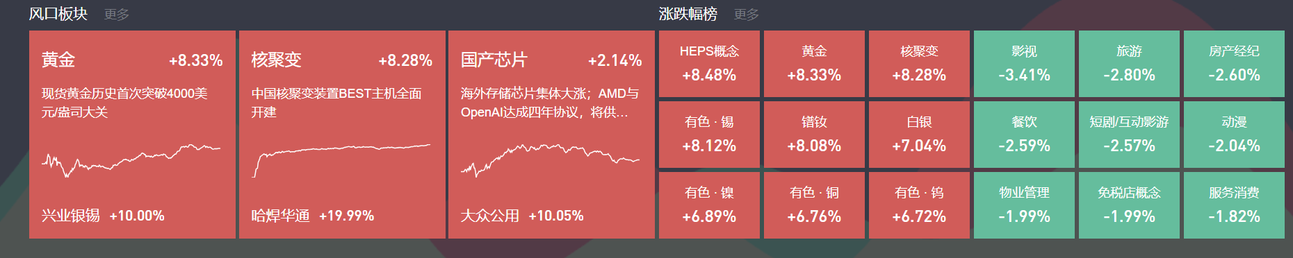 一、行情回顾 沪指全天震荡走强,站上3900点关口,刷新2015年8月以来新高,创业板指则冲高回落。黄金股集体大涨,四川黄金、山东黄金等多股涨停。可控核聚变概 念爆发,国光电气、中国核电等十余股封板。稀土永磁板块拉升,北方稀土等涨停。下跌方面,影视股调整,中国电影等跌停;芯片股冲高回落,张建高科 跌停。个股涨多跌少,沪深京三市超3000股飘红,今日成交2.67万亿。 1.矿产资源 黄金板块今日大涨,兴业银锡3天2板,盛屯矿业2连板,白银有色、中国黄金等多股涨停。 催化上,现货黄金历史首次突破4000美元/盎司大关,年内涨幅超52%;现货白银涨突破49.40美元,不断刷新2011年以来最高位。 9日盘前稀土行业再迎重要催化:商务部发布公告称,决定对稀土相关技术等物项实施出口管制。其中提到,最终用途为研发、生产14纳米及以下逻辑芯片 或者256层及以上存储芯片,以及制造上述制程半导体的生产设备、测试设备和材料,或者研发具有潜在军事用途的人工智能的出口申请,逐案审批。 资料显示,稀土元素钕、镨等是制造半导体前端工艺中关键部件(如刻蚀机、沉积设备)和先进封装材料核心资源。 | 股票名称 | | 最新价 = | 涨跌幅 ...
