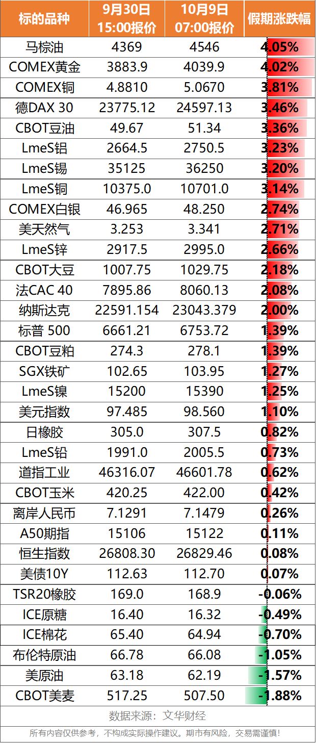 来源:市场资讯 (来源:一德期货) | 标的品种 | 9月30日 | 10月9日 | 假期涨跌幅 | | --- | --- | --- | --- | | | 15:00报价 | 07:00报价 | | | 马棕油 | 4369 | 4546 | 4.05% | | COMEX黄金 | 3883.9 | 4039.9 | 4.02% | | COMEX铜 | 4.8810 | 5.0670 | 3.81% | | 德DAX 30 | 23775.12 | 24597.13 | 3.46% | | CBOT豆油 | 49.67 | 51.34 | 3.36% | | LmeS铝 | 2664.5 | 2750.5 | 3.23% | | LmeS锡 | 35125 | 36250 | 3.20% | | LmeS铜 | 10375.0 | 10701.0 | 3.14% | | COMEX白银 | 46.965 | 48.250 | 2.74% | | 美天然气 | 3.253 | 3.341 | 2.71% | | LmeS锌 | 2917.5 | 2995.0 | 2.66% | | CBOT大豆 | 1 ...