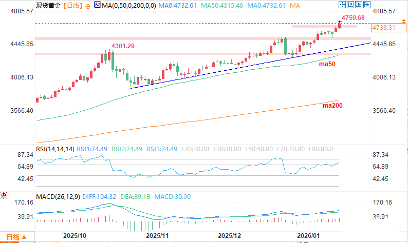 随着贸易战风险加大,投资者对全球经济衰退的预期升温,避险需求推动黄金价格走高。美国降息的预期加强, 进一步支持黄金市场的需求,短期内可能继续推高金价。 近年来,各国央行持续增持黄金,减轻对美元的依赖,为金价提供了长期支撑。2025年,全球央行的大规模购金 推动了黄金的稳步上涨。进入2026年后,地缘政治事件成为新的推力。例如,委内瑞拉总统被扣押、伊朗局势动 荡等事件导致金价在20天内上涨了9.6%。这些突发的政治事件引发市场不确定性,促使投资者寻求避险资产,黄 金作为避险资产的需求急剧上升。 美联储降息的时机不明,市场对宽松货币政策的预期依然存在,为黄金提供支持。全球经济不确定性加剧时,货 币政策宽松预期常常推动黄金需求。即便美联储降息时间尚不确定,市场预期可能在一定程度上推动金价上涨。 周二(1月20日)美盘时段,现货金价再创历史新高,触及每盎司4748.71美元,临近5000美元。上方缺乏明显技 术阻力,使得金价上涨的终点难以预测。5000美元成为投机者关注的整数目标。技术面支撑位为4584.21美元, 次支撑位在4536.49美元。 当前市场普遍担忧经济增长放缓。贸易战升级可能对全球经济产生较大影响,但 ...