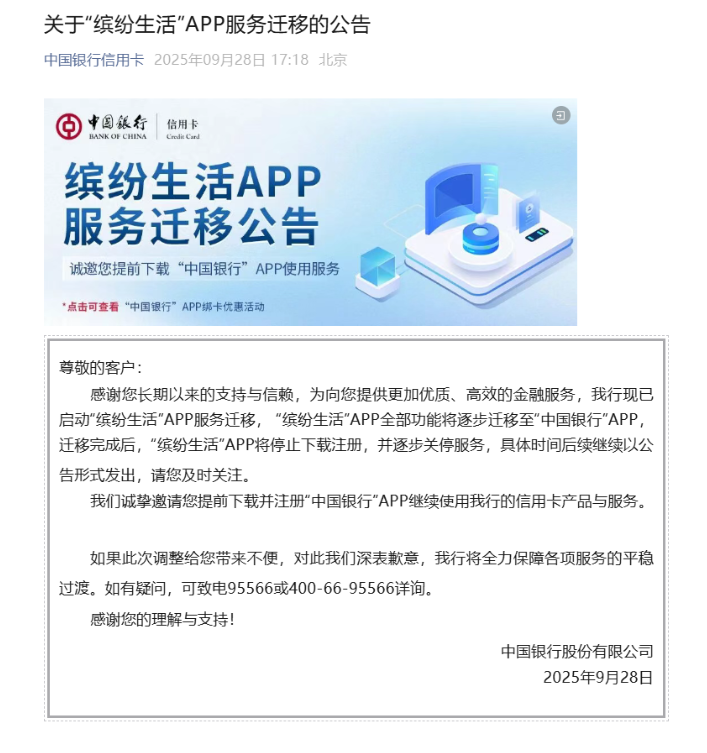 9月28日,中国银行发布公告称,该行已启动"缤纷生活"App服务迁移,"缤纷生活"App全部功能将逐步迁移至"中国银行"App。迁移完成后,"缤纷生活"App 将停止下载注册,并逐步关停服务。据梳理,自2024年以来已有十余家银行密集关停独立APP,其中信用卡类与直销银行类应用成为整合重灾区。 国有大行的整合动作颇具风向标意义,除中行外,其他机构或已落地整合方案,或通过功能优化释放"瘦身"信号。在股份行中,渤海银行已于2024年12月30 日完成信用卡APP关停,功能全部迁移至主APP信用卡板块,其公告早在当年5月便提前半年公示过渡期安排,为行业提供了可复制的操作模板。而在国有 六大行内部,整合趋势同样清晰:建设银行虽暂未关停独立的"建行生活"APP,但在2024年底上线的手机银行2025版中,已强化与"建行生活"的融合联动, 实现用户体系互通、权益共享;工商银行则早在2021年便终止运行多个总行级冗余APP,将"中国工商银行电子银行"公众号整体迁移至"中国工商银行客户 服务"公众号,实现服务入口集中化。值得注意的是,民生银行也于2024年12月通过董事会决议,调整信用卡分中心设置,为后续APP整合奠定组织基 ...
