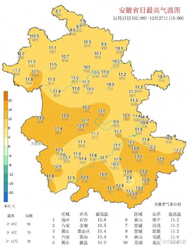 截至27日15时最高气温显示 安徽气象台预报 31日至2026年1月2日 江淮之间中西部及江南大部13℃左右 其他大部10℃左右 阳光让2025最后一个双休充满了暖意 不过新一波冷空气已经打包完成 安徽大部将出现一轮"跨年"雨雪 全省具体预报 28日(周日):全省晴天。 29日(周一):全省多云转晴天。 30日(周二):淮河以北多云到阴天,淮河以南多云。 31日(周三):沿江江北阴天,夜里有小雨,其中沿淮淮北局部中雨,部分地区有雨夹雪或雪;江南多 云转阴天。 2026年1月1日(周四):全省阴天有小雨,其中沿淮淮北和本省山区有雨夹雪或雪。 1月2日(周五):淮河以北阴天转多云;淮河以南阴天,其中江南南部有小雨或雨夹雪。 我省有一次降水过程 部分地区有雨夹雪或雪 受冷空气影响 全省平均气温将下降5~8℃ 同时全省平均风力增大到3~4级 阵风7级 城市天气预报 | | @ 安徽气象 | | | 哥城市预报 | | | | | --- | --- | --- | --- | --- | --- | --- | --- | | 日期 | 12 27 | 12月28日 | 12月29日 | 12月30日 | 12 31 ...