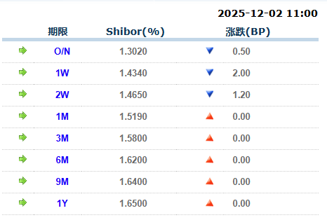 银行间质押式回购市场方面,短期品种利率小幅下调。具体看,DR001、R001加权平均利率分别下行0.9BP、1.0BP,报1.2973%、1.3611%,成交额分别减 少580亿元、增加2459亿元;DR007、R007加权平均利率分别下行1.7BP、0.7BP,报1.441%、1.4862%,成交额分别增加340亿元、187亿元;DR014、R014 加权平均利率分别下行0.2BP、0.2BP,报1.4694%、1.5083%,成交额分别增加1亿元、减少16亿元。 新华财经北京12月2日电 人民银行2日开展1563亿元7天期逆回购操作,操作利率1.40%,与前次持平;鉴于当日有3021亿元7天期逆回购到期,公开市场实现 净回笼1458亿元。 上海银行间同业拆放利率(Shibor)短期品种利率均有小幅下跌。具体来看,隔夜Shibor下跌0.50BP,报1.3020%;7天Shibor下跌2.00BP,报1.4340%;14天 Shibor下跌1.20BP,报1.4650%。 | | | | 2025-12-02 11:00 | | --- | --- | --- | --- | | | 期限 | Shibor ...