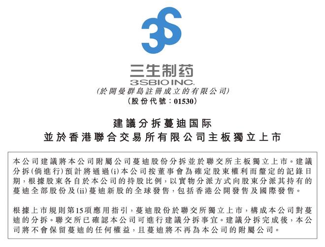 【文/王力 编辑/周远方】 11月20日晚间,港股上市公司三生制药(01530.HK)发布公告,宣布将旗下消费医药业务板块蔓迪国 际分拆至港交所主板独立上市,华泰国际担任独家保荐人。这意味着,这家凭借米诺地尔产品连续十年 稳居中国脱发药物市场榜首的企业,即将以独立身份登陆资本市场。 蔓迪国际的背后,站着三生制药的灵魂人物——娄竞。1993年,娄竞的父亲、生物医学专家娄丹在沈阳 创立了三生制药。彼时正在美国福特汉姆大学攻读分子与细胞生物学博士学位的娄竞,于1995年学成归 国,加入父亲创办的公司担任研发主管,此后逐步接手公司管理,现任三生制药董事长兼首席执行官。 2015年,三生制药全资收购了拥有蔓迪品牌的浙江万晟药业,将其纳入集团化药发展平台。如今,这一 业务板块被推向独立上市,娄竞仍通过信托安排控制蔓迪国际的员工持股平台。 根据招股书披露,三生制药目前持有蔓迪国际约87.16%的股权,阿里健康等机构投资者亦在股东名单 之中。值得注意的是,公告明确指出分拆完成后三生制药将不会保留蔓迪国际的任何权益,这意味着蔓 迪将彻底脱离母公司,以独立个体在市场中搏杀。在集采降价、竞争加剧的行业背景下,这家"防脱神 药"制造 ...