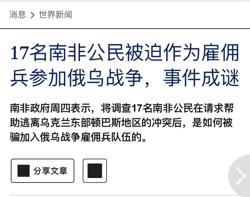 木叔在这篇国际评论中分析了乌克兰外长的一番话,重点讨论了俄罗斯军方招募非洲人为雇佣兵参与俄乌战争的情 况。 11月8日,媒体引用乌克兰外长西比加的话,曝光了俄罗斯军方招募来自非洲的雇佣兵参战的消息。根据西比加的说 法,目前至少有来自36个非洲国家的1436名当地人参与了俄罗斯方面的军事行动,然而"实际的招募人数可能会更 多"。他指出,这些非洲人并非自愿加入,而是被俄罗斯通过金钱诱惑和欺骗手段签署了军事合同,实际上是在为俄 罗斯的战争买命。西比加还强调,大多数雇佣兵在战场上的生存时间非常短,通常不会超过一个月。 那么,乌克兰外 长为何突然提到非洲雇佣兵的问题呢?首先,肯尼亚总统最近在社交媒体上表示,他与乌克兰总统泽连斯基进行了通 话。在通话中,肯尼亚总统希望泽连斯基能够帮助释放被乌克兰军队拘留的肯尼亚公民。他表示,肯尼亚公民被骗到 俄罗斯参战,如果乌克兰军队能将这些人从战场带回来,希望他们能够顺利回国。其次,正好在同一天,路透社援引 南非政府官员的话报道,南非政府收到了17名在俄罗斯参战的南非公民的求救电话。这些人表示,他们被承诺签订有 利可图的合同,诱骗到俄罗斯,结果被困在顿巴斯地区。南非总统拉马福萨对此表示 ...