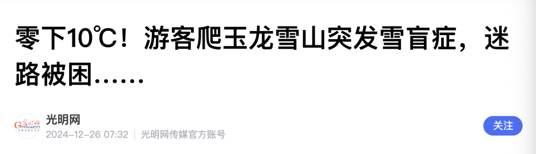 Core Viewpoint - The article highlights the risks of snow blindness, a condition caused by prolonged exposure to UV rays reflected off snow, emphasizing the importance of eye protection for outdoor enthusiasts during winter activities [1][3]. Group 1: Understanding Snow Blindness - Snow blindness, medically known as "photokeratitis," is a temporary eye inflammation caused by UV rays damaging the corneal epithelial cells [3][5]. - The high reflectivity of snow can reflect nearly 95% of UV rays, making direct exposure to snow as harmful as looking directly at the sun [5]. - Snow blindness can occur in various environments, not just snowy areas, including high-altitude climbing, glacier hiking, and even indoor settings with UV exposure [5]. Group 2: Symptoms and Recovery - Symptoms of snow blindness typically manifest 4 to 12 hours after exposure and include redness, tearing, pain, light sensitivity, and blurred vision [6][9]. - Mild cases may resolve with rest in about 6 hours, while moderate to severe cases could take 2 to 4 days for recovery [9][10]. Group 3: Emergency Response - Immediate actions to take if symptoms occur include avoiding light, stopping outdoor activities, and seeking shade [8][9]. - Rubbing the eyes should be avoided as it can worsen the condition [7]. - Cold compresses can help alleviate pain, and medical attention is advised for severe symptoms [8][9]. Group 4: Prevention Strategies - Wearing UV400-rated goggles is crucial to block harmful UV rays during snow activities [10][12]. - Even on cloudy days or at night, UV protection is necessary due to the reflective properties of snow [11][12]. - Limiting exposure time to 1-2 hours in strong sunlight and taking breaks in shaded areas can reduce the risk of snow blindness [11][12].