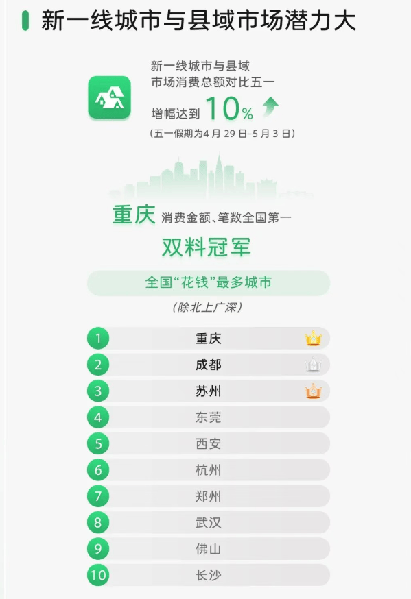 近日 "微信派"公众号发布了 "微信国庆中秋数据报告" 报告显示 在长沙 大家都花了哪些钱? 长沙上榜 全国"花钱"最多城市 (除北上广深)榜单 位列第十 | 新一线城市与县域 | | | | --- | --- | --- | | 市场消费总额对比五一 19 | | | | 增幅达到 10% | | | | (五一假期为4月29日-5月3日) | | | | 重庆 消费金额、笔数全国第一 | | | | 双料冠军 | | | | 全国"花钱"最多城市 | | | | (除北上广深) | | | | 1 | 重庆 | | | 2 | 成都 | 0140 | | 3 | 苏州 | 10 | | 4 | 东莞 | | | 5 | 西安 | | | 6 | 杭州 | | | 7 | 美区州 | | | 8 | 武汉 | | | 9 | 佛山 | | | 10 | 长沙 | | 据第三方映潮科技数据,9月30日-10月7日,全市商品和服务销售总额达270亿元,同比增长8.6%,高于全省1.4个百分点,其中商品销售额135.4亿元,同 比增长6.1%;服务销售额134.7亿元,同比增长11.2%。 根据手机信令大数据建 ...