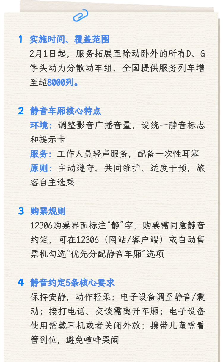 中国国家铁路集团有限公司介绍,为进一步提升旅客出行体验,倡导和共建文明、温馨、安静的旅行环境,铁路部门大力推广"静音车厢"服务,自2月1日 起,"静音车厢"服务将拓展至除动卧列车之外的"D"字头、"G"字头动力分散动车组列车,届时全国铁路提供"静音车厢"服务的列车将增至超8000列,更好 地满足广大旅客对美好旅行生活的需求。 "静音车厢"是指通过调整列车影音广播音量、引导旅客安静行为,为旅客提供相对安静的列车旅行环境,以满足旅客差异化出行需求、提升旅行体验的车 厢,设置规范统一的静音标志和服务提示卡,列车工作人员采用轻声服务,并配备一次性耳塞供有需求的旅客使用。"静音车厢"实行"主动遵守、共同维 护、适度干预"原则,旅客可自主选乘。 提供"静音车厢"服务的列车在铁路12306购票界面上标注"静"字,旅客购票时须同意静音约定,方可购买"静音车厢"车票。静音约定包括:一是在"静音车 厢"内须保持安静,动作轻柔避免产生噪声;二是将手机等电子设备调至静音或震动状态;三是在接打电话或相互交谈时离开"静音车厢";四是在使用电 子设备时佩戴耳机或关闭音源外放功能;五是携带儿童出行的旅客照看好孩子,避免喧哗、哭闹。旅客发生违 ...