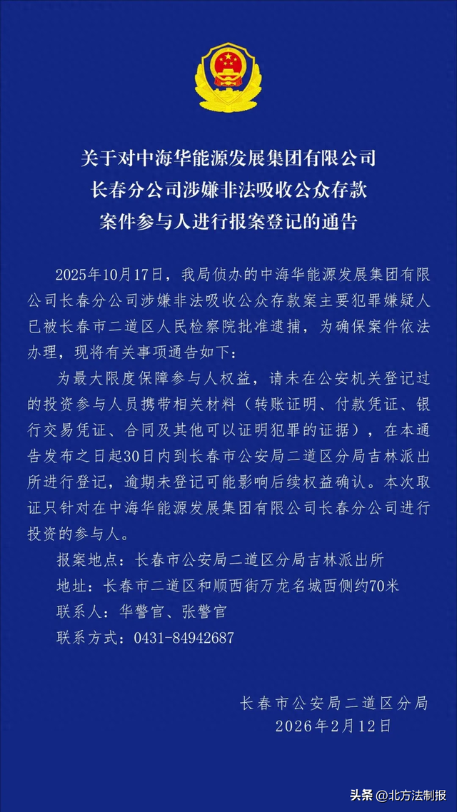 为最大限度保障参与人权益,请未在公安机关登记过 的投资参与人员携带相关材料(转账证明、付款凭证、银 行交易凭证、合同及其他可以证明犯罪的证据),在本通 告发布之日起30日内到长春市公安局二道区分局吉林派出 所进行登记,逾期未登记可能影响后续权益确认。本次取 证只针对在中海华能源发展集团有限公司长春分公司进行 投资的参与人。 报案地点:长春市公安局二道区分局吉林派出所 地址:长春市二道区和顺西街万龙名城西侧约70米 联系人:华警官、张警官 联系方式:0431-84942687 长春市公安局二道区分局 2026年2月12日 头条 @北方法制报 关于对中海华能源发展集团有限公司 长春分公司涉嫌非法吸收公众存款 案件参与人进行报案登记的通告 2025年10月17日,我局侦办的中海华能源发展集团有限 公司长春分公司涉嫌非法吸收公众存款案主要犯罪嫌疑人 已被长春市二道区人民检察院批准逮捕,为确保案件依法 办理,现将有关事项通告如下: ...