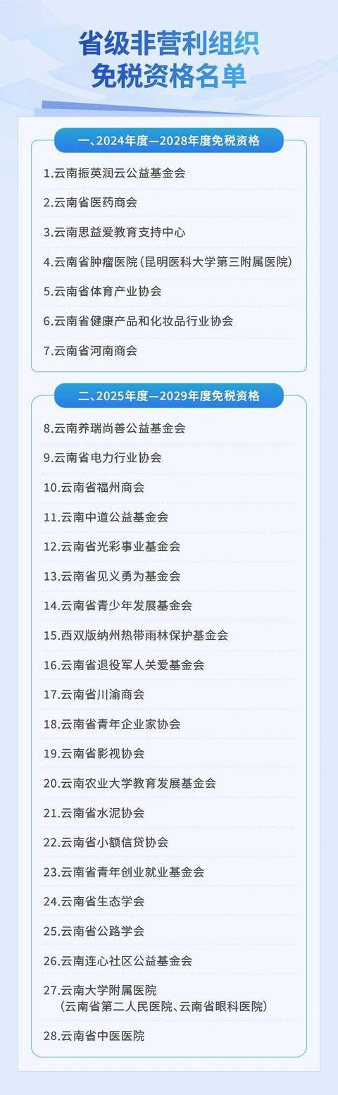Core Viewpoint - 28 organizations in Yunnan Province have been granted provincial-level nonprofit tax-exempt status, allowing them to exempt certain income from corporate income tax [1] Summary by Category Tax Exemption Criteria - Eligible nonprofit organizations can exempt income from corporate income tax, including donations from individuals or other entities, government subsidies (excluding those from government service purchases), membership fees as per regulations from civil affairs and finance departments, interest income from non-taxable and tax-exempt income, and other income as specified by the Ministry of Finance and the State Administration of Taxation [1] List of Tax-Exempt Organizations - The list of organizations granted tax-exempt status includes: - Yunnan Heroic Acts Foundation - Yunnan Youth Development Foundation - Xishuangbanna Tropical Rainforest Protection Foundation - Yunnan Veterans Care Foundation - Yunnan Chuan-Yu Chamber of Commerce - Yunnan Young Entrepreneurs Association - Yunnan Film and Television Association - Yunnan Agricultural University Education Development Foundation - Yunnan Cement Association - Yunnan Microfinance Association - Yunnan Youth Entrepreneurship and Employment Foundation - Yunnan Ecological Society - Yunnan Highway Society - Yunnan Lianxin Community Public Welfare Foundation - Yunnan University Affiliated Hospital (including Yunnan Second People's Hospital and Yunnan Eye Hospital) - Yunnan Traditional Chinese Medicine Hospital [2][4]