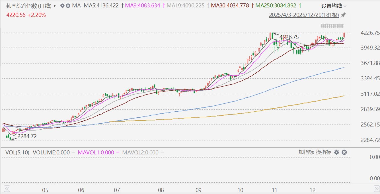 格隆汇12月29日|韩国综合指数收盘上涨90.87点,涨幅2.2%,报4220.55点。 ...