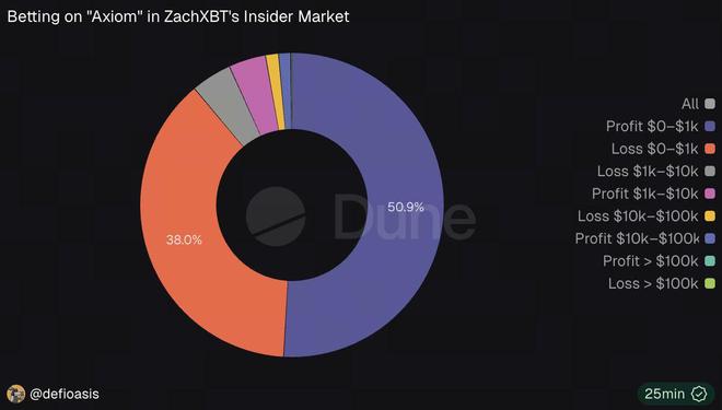 来源:市场资讯 (来源:吴说) 吴说获悉,据 @defioasis 调查,在某预测市场的 ZachXBT 内幕调查事件中,有超过 3,630 个地址押注 了"Axiom",其中 56.2% 的地址获得正向盈利;然而在 Top10 大额盈利地址中,有 8 个地址可被视为是 内幕地址,合计获利超过 120 万美元,特点是交易的市场次数极少甚至只有唯一一个;有 3 个地址获得 超过 10 万美元盈利和 47 个地址盈利 1 万 – 10 万美元,同时亦有 2 个地址亏损超过 10 万美元和 50 个 地址亏损 1 万 – 10 万美元。 ...