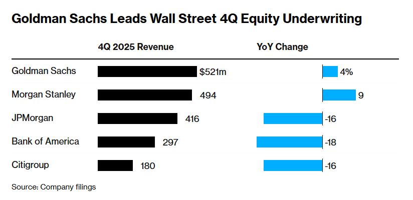 华尔街金融巨头高盛集团(GS.US)在去年最后一个季度重新回到了华尔街股票资本市场(即ECM市场)营收排行榜的榜 首位置,高盛夺魁之际正值华尔街各大银行业巨头们争夺有望于2026年在美股市场进行首次公开募股(IPO)大型项目 (包括OpenAI、Anthropic以及SpaceX等)的承销角色。此外,高盛集团正在密切关注预测市场(Prediction Markets)领域 的重大投资机遇,希望借此在这一快速增长的且围绕现实世界事件下注的平台中获益,力争成为类似Polymarket这样 的预测市场平台。 这家总部位于纽约的金融巨头报告称,2025年最后三个月,其股票承销性质的营收约为5.21亿美元,超越了摩根士丹 利的4.94亿美元和摩根大通的4.16亿美元同项业务营收规模。 短期内难以逾越 高盛首席执行官大卫.所罗门表示,这一数字(2025年最后三个月的股票承销类营收数据)在短期内不太可能被超越。 如上图所示,高盛领跑华尔街第四季度股票承销业务。 "我猜测,股票资本市场的整体水平在2026年仍会明显低于2021年的峰值,但会稍微高于今年的水平,至于季度水平 则难以精准预测。"所罗门在周四的银行财报电话会议上告 ...