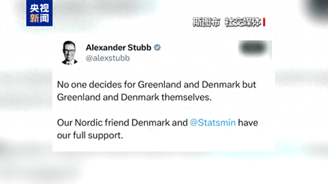 芬兰总统斯图布5日表示,除了格陵兰岛和丹麦之外,没有任何一方可以代替它们作出决定,芬兰全力 支持丹麦和丹麦首相弗雷泽里克森。 转自:北京日报客户端 1月4日,美国总统特朗普在接受采访时再称"我们绝对需要格陵兰岛"。丹麦首相弗雷泽里克森4日表 示,美国无权吞并格陵兰岛,她要求美方停止威胁丹麦和格陵兰人民。 法国外交部发言人帕斯卡尔·孔法夫勒接受采访时表示,格陵兰岛属于格陵兰人民和丹麦人民,该由他 们决定自己的未来。 格陵兰岛是世界第一大岛,也是丹麦的自治领地。特朗普自去年上任以来曾多次扬言要得到格陵兰岛。 来源:央视新闻客户端 挪威首相斯特勒同一天表示,格陵兰岛是丹麦不可分割的一部分。挪威全力声援丹麦。 ...