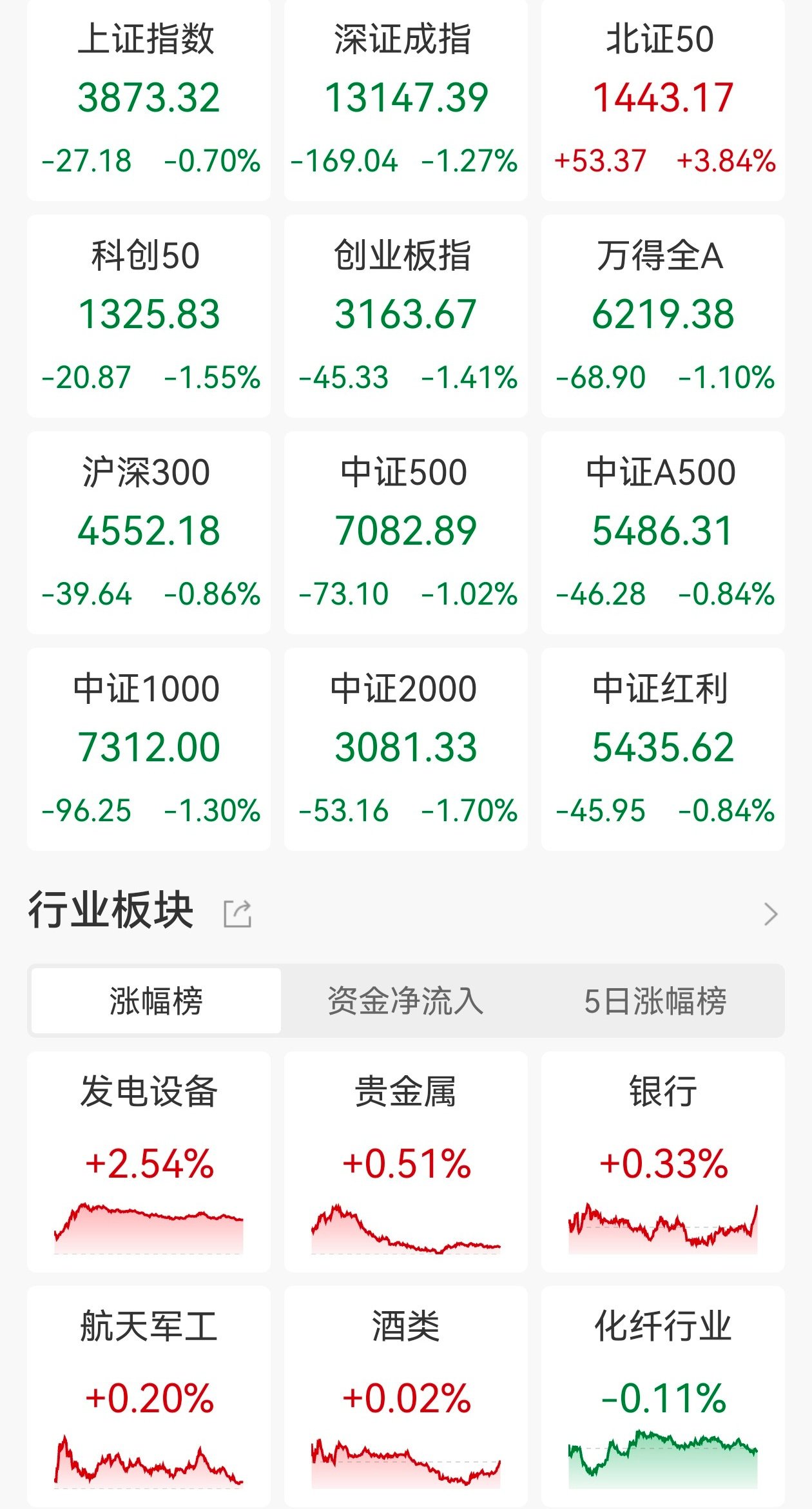 | 涨幅榜 | 资金净流入 | 5日涨幅を | | --- | --- | --- | | 发电设备 | 贵金属 | 银行 | | +2.54% | +0.51% | +0.339 | | 航天军工 | 酒类 | 化纤行」 | | +0.20% | +0.02% | -0.119 | A股三大指数今日高开后震荡下行,截至收盘,沪指跌0.7%报3873点,深证成指跌1.27%,创业板指跌1.41%,北证50指数逆市上涨3.84%。全市场成交额 1.89万亿元,较前一交易日增量936亿元,超4300股下跌。 盘面上,房地产板块走低,中国武夷跌停;福建板块回调,华映科技、厦门信达等多股跌停;免税概念下挫,广百股份跌近9%;水产养殖板块走弱,天马 科技跌停;小红书概念、商业百货及预制菜概念等跌幅居前。另外,可控核聚变板块爆发,天力复合30CM涨停、华菱线缆、雪人股份等多股涨停;风电设 备板块走高,金风科技涨停;超导概念拉升,永鼎股份涨停;商业航天、仪器仪表等少数板块涨幅居前。(格隆汇) | 上证指数 | 深证成指 | 北证5( | | --- | --- | --- | | 3873.32 | 13147.39 | ...