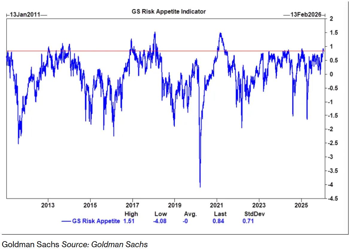 智通财经APP注意到,高盛集团客户的乐观情绪激增至约一年来的最高水平,对全球增长的信心压倒了对地缘政治和宏观经济的担忧。 他在一份致客户的报告中写道:"当宏观背景提供支撑时,风险偏好上升本身并不是卖出信号,乐观态势持续的时间可能比大多数人预期的更长。驱动这一 现象的因素是健康的——全球增长乐观情绪已经激增。" 不过,科珀史密斯补充道:"在目前这些水平上,小幅回调往往会变得更加频繁,而超额的股票回报则变得更加罕见。" 在连续三年实现两位数回报后,标普500指数在2026年上涨了约0.7%,并在历史高位附近波动。高盛的这一指标与华尔街策略师们的乐观观点相吻合,他们 普遍预计标普500指数今年将再次表现强劲。 地缘政治担忧确实在周三有所突破,由于对美国可能针对伊朗采取行动的担忧,基准指数下跌了约1%。 增长乐观情绪 高盛交易部门的数据显示,高盛的"风险偏好指标"攀升至2025年初以来的最高点,处于历史水平的第96百分位。 高盛董事总经理李·科珀史密斯表示,虽然风险偏好的升高通常被视为投资者过度狂热的信号,但美国和其他地区动态的增长势头可能证明,这一次的看涨 前景是有据可依的。 该行称,这种转变在美国周期性行业尤为明 ...