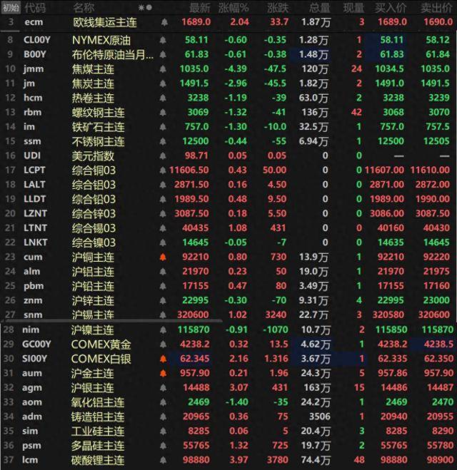 来源:上海有色网 金属市场: 截至今日15:03分行情 | 初始 代码 | | 名称 | 米 @ | 最新 | 涨幅% | 涨跌 | 总量 | 我最 | 求人价 | 英出价 | | --- | --- | --- | --- | --- | --- | --- | --- | --- | --- | --- | | 3 | ecm | 欧线集运 十连 | 4 | 1689.0 | 2.04 | 33.7 | 1.87 ] | 3 | 1689.0 | 1690.0 | | 8 | CLOOY | NYMEX原油 | @ | 58.11 | -0.60 | -0.35 | 1.28万 | 1 | 58.11 | 58.12 | | 9 | BOOY | 布伦特原油当月 ... 4 | | 61.83 | -0.61 | -0.38 | 1.48万 | 2 | 61.83 | 61.84 | | 10 | jmm | 焦煤主连 | 4 | 1035.0 | -4.39 | -47.5 | 120万 | 24 | 1034.5 | 1035.0 | | 11 | jm | 焦炭主连 | 4 | 1491.5 | - ...
