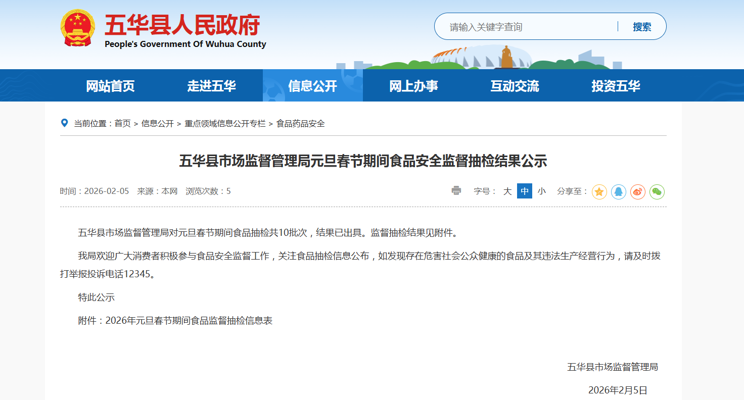 Group 1 - The Wuhua County Market Supervision Administration conducted food sampling inspections during the New Year and Spring Festival period, with a total of 10 batches tested [3] - The results of the supervision and sampling inspections have been published [3] - The administration encourages consumers to actively participate in food safety supervision and to report any harmful food or illegal production and operation behaviors by calling the complaint hotline 12345 [3]
