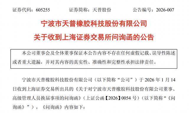 Core Viewpoint - Tianpu Co., Ltd. (SH605255) is under scrutiny from the Shanghai Stock Exchange regarding its recent board restructuring and the appointment of new senior management, particularly concerning the implications for its core business and the independence of its management team [2][3]. Group 1: Board Restructuring and Management Appointments - Tianpu Co., Ltd. announced the completion of its board restructuring, with key appointments including Yang Gongyifan as Chairman and Chen Jie as Vice General Manager and CFO [2]. - The new appointees lack experience in Tianpu's original automotive parts business, raising concerns about their ability to manage the company's existing operations effectively [2][3]. - The Shanghai Stock Exchange has requested clarification on the rationale behind these appointments and their alignment with the company's business strategy [3]. Group 2: Impact on Business Operations - The company previously stated that there were no plans for significant changes to its core business or asset injections from the acquiring party, Zhonghao Xinying [2][3]. - The exchange is questioning whether the recent management changes indicate a shift in strategy that contradicts earlier disclosures [3]. - Tianpu's board nomination committee is expected to provide a clear opinion on the implications of these changes for the company's business operations [3]. Group 3: IPO Plans and Compliance - Zhonghao Xinying has initiated its independent IPO process, which is reportedly unrelated to Tianpu; however, the appointment of its key management to Tianpu raises questions about potential conflicts [3][4]. - The exchange has requested an assessment of how these appointments might affect Zhonghao's IPO plans and whether they pose any substantial barriers [3]. - Tianpu has received a notice from the China Securities Regulatory Commission regarding an investigation, prompting the company to evaluate the impact on the qualifications of its directors and senior management [5]. Group 4: Financial Performance - For the first three quarters of 2025, Tianpu reported a revenue of 230 million CNY, a year-on-year decrease of 4.98%, and a net profit of 17.85 million CNY, down 2.91% [6]. - The company's stock price has experienced significant volatility, with a notable increase of 718% from August 22 to December 30, 2025, following the announcement of Zhonghao's intention to acquire [6]. - As of January 15, 2026, Tianpu's stock was trading at 174.83 CNY, reflecting a 10% decline on that day [6][7].