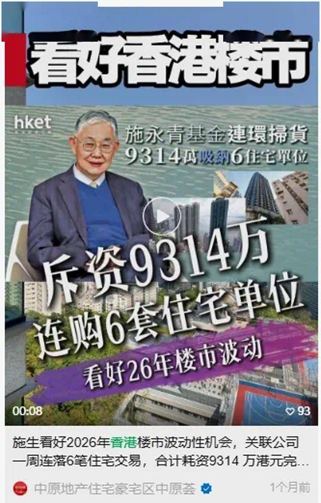 Group 1 - The core viewpoint is that the recent rumors about the founder of Centaline Property, Shih Yongqing, "sweeping up" the Hong Kong property market are clarified as actions taken by his fund, not personal investments [1][3] - Since October 2025, Shih Yongqing's fund has purchased a total of 6 residential units in Hong Kong, including properties in Sai Wan and Tsim Sha Tsui, with a total expenditure exceeding HKD 93.14 million [1] - Shih Yongqing expressed that the timing of investment is more critical than price levels, noting that the Hong Kong property market has only declined by 30%, and the investment outlook is not as favorable as in 2023 [3] Group 2 - Shih Yongqing emphasized the cyclical nature of the Hong Kong property market, indicating that a bottoming signal has been confirmed, and the market is showing a "U" shaped trend [3] - He anticipates that the property market will see a significant increase in 2026, while noting that the secondary market is experiencing a lag in response to market changes [3]