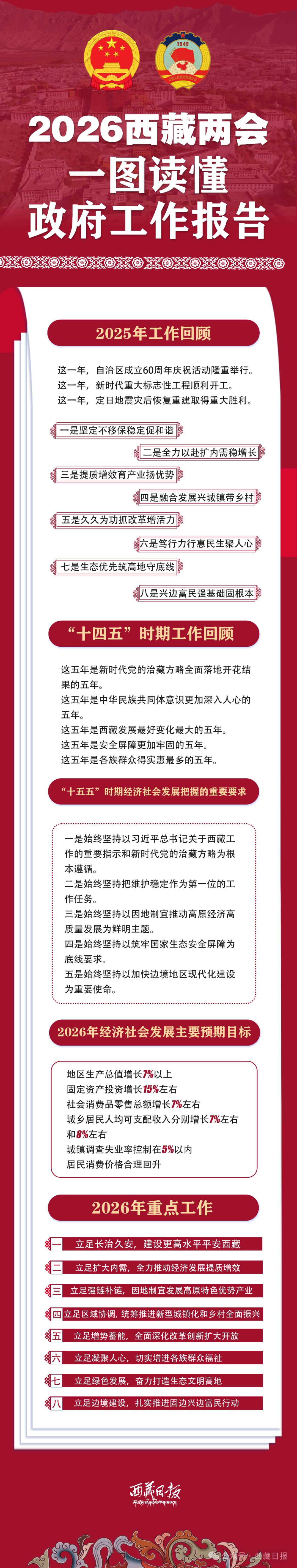 Core Viewpoint - The article highlights the significant achievements and future goals of economic and social development in Tibet, emphasizing stability, high-quality growth, and ecological safety as key priorities. Group 1: Achievements in Recent Years - The year marked the 60th anniversary of the establishment of the autonomous region, celebrated with grand activities [2] - Major engineering projects commenced successfully, indicating progress in infrastructure development [2] - Significant victories were achieved in post-earthquake recovery and reconstruction efforts [2] Group 2: Five-Year Review - The past five years have seen the comprehensive implementation of the Party's strategies in Tibet, leading to notable changes and improvements [5] - There has been a deepening awareness of the shared identity among the Chinese nation [5] - The development in Tibet has been characterized as the best and most transformative in recent history [5] - The security framework has become more robust, ensuring safety for all ethnic groups [5] - The benefits received by various communities have increased significantly [5] Group 3: Key Requirements for Future Development - The focus will remain on maintaining stability as the primary task [7] - High-quality economic development tailored to local conditions will be a central theme [7] - Strengthening the national ecological security barrier will be a fundamental requirement [7] - Accelerating modernization in border areas will be an important mission [7] Group 4: Economic and Social Development Goals for 2026 - The GDP is expected to grow by over 7% [8] - Fixed asset investment is projected to increase by around 15% [8] - Retail sales of consumer goods are anticipated to grow by 7% [8] - Per capita disposable income for urban and rural residents is expected to rise by approximately 7% and 8%, respectively [8] - The urban unemployment rate is targeted to be kept below 5% [8] - Consumer prices are expected to rise reasonably [8] Group 5: Key Focus Areas for 2026 - Building a higher level of safety in Tibet, focusing on long-term stability [8] - Expanding domestic demand to enhance economic quality and efficiency [8] - Developing highland characteristic industries based on local advantages [8]