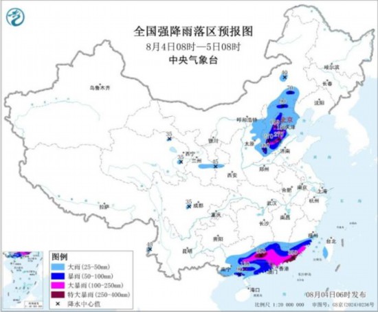 昨日8时至今日6时,西北地区东部、华北中部至东北地区东部和南部等部分地区出现大雨或暴雨, 甘肃甘南和庆阳、宁夏吴忠、陕西延安、河北保定等局地大暴雨(100~137毫米);江南东部、华南及云 南西部等部分地区出现暴雨,广东中部和东部沿海、广西柳州、云南德宏等地大暴雨,广东汕尾和揭 阳、广西柳州局地特大暴雨(250~280毫米)。 中东部出现大范围高温天气 昨日,四川盆地、西北地区东部、华北南部至江南等大部地区出现35℃以上的高温天气,陕西中南 部、四川东部、重庆等部分地区达40~43.8℃。 中新网8月4日电 据中央气象台网站消息,昨日,华南、云南及西北地区东部至东北等地出现较强 降雨,中东部出现大范围高温天气。预计未来三天,华北、华南等地有强降雨天气,关注暴雨可能引发 的次生灾害,及对交通运输、暑期旅游、城市安全等不利影响;中东部地区高温范围广、强度大,关注 高温趋势及影响。 华南云南及西北地区东部至东北等地出现较强降雨 国内未来三天具体预报 8月4日08时至5日08时,青海东部、甘肃中东部、内蒙古中东部、山西中东部、京津冀、河南北 部、广西大部、广东、香港、澳门、福建南部、云南西部、台湾岛等地部分地区有大到 ...