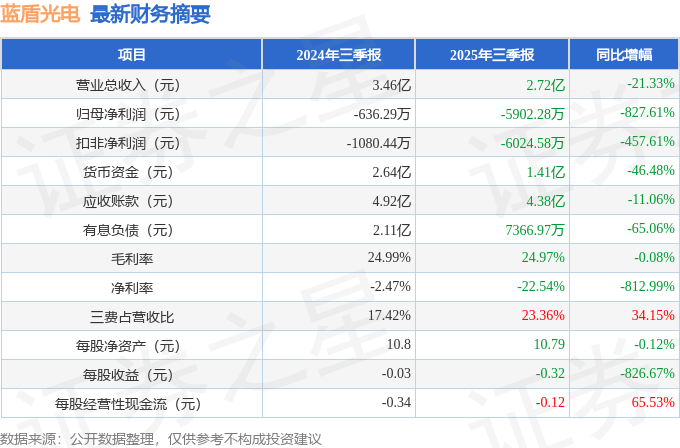 本次财报公布的各项数据指标表现不尽如人意。其中,毛利率24.97%,同比减0.08%,净利 率-22.54%,同比减812.99%,销售费用、管理费用、财务费用总计6360.62万元,三费占营收比 23.36%,同比增34.15%,每股净资产10.79元,同比减0.12%,每股经营性现金流-0.12元,同比增 65.53%,每股收益-0.32元,同比减826.67% | 项目 | 2024年三季报 | 2025年三季报 | 同比增幅 | | --- | --- | --- | --- | | 营业总收入(元) | 3.46亿 | 2.72亿 | -21.33% | | 归母净利润(元) | -636.29万 | -5902.28万 | -827.61% | | 扣非净利润(元) | -1080.44万 | -6024.58万 | -457.61% | | 货币资金(元) | 2.64亿 | 1.41亿 | -46.48% | | 应收账款(元) | 4.92亿 | 4.38亿 | -11.06% | | 有息负债 (元) | 2.11亿 | 7366.97万 | -65.06% | | 毛利率 | 24.99 ...