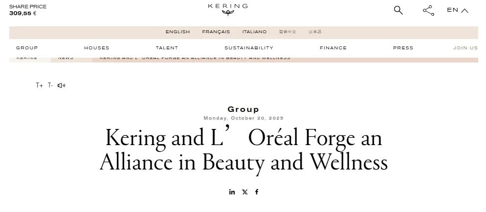 欧莱雅集团与开云集团于10月20日共同宣布,双方已达成一项价值40亿欧元的战略合作协议。 根据协议,欧莱雅将将以现金方式支付40亿欧元的价格收购开云集团的美妆业务,其中包括香水品牌Creed的所有权,以及古驰、葆蝶家和巴 黎世家三大奢侈品牌为期50年的美妆及香水独家授权。 第三项合作是合资企业设立。除了美妆领域,双方还将共同成立一家股权各占50%的合资公司,联手探索奢侈品、健康与长寿领域的商业机 会。 出售美妆业务的背后,是开云集团严峻的财务压力。截至2025年6月底,开云的净负债额已达95亿欧元,还有60亿欧元的长期租赁负债。 开云集团CEO Luca de Meo 表示,"此次战略联盟对开云而言是关键一步。与全球美妆领导者联手,能加速旗下主要品牌在香水和化妆品领域 的发展,实现规模效应,释放长期潜力,就像YSL美妆在欧莱雅管理下取得成功那样。" 但开云选择出售美妆业务仍旧引发极大的震动。 此次交易预计将于2026年上半年完成,目前仍需获得监管部门批准。 根据双方协议,欧莱雅与开云集团的合作包含三大关键布局: 首先是欧莱雅将收购开云集团旗下的美妆业务,其中包括开云集团在2023年才以35亿欧元价格收购的香水 ...