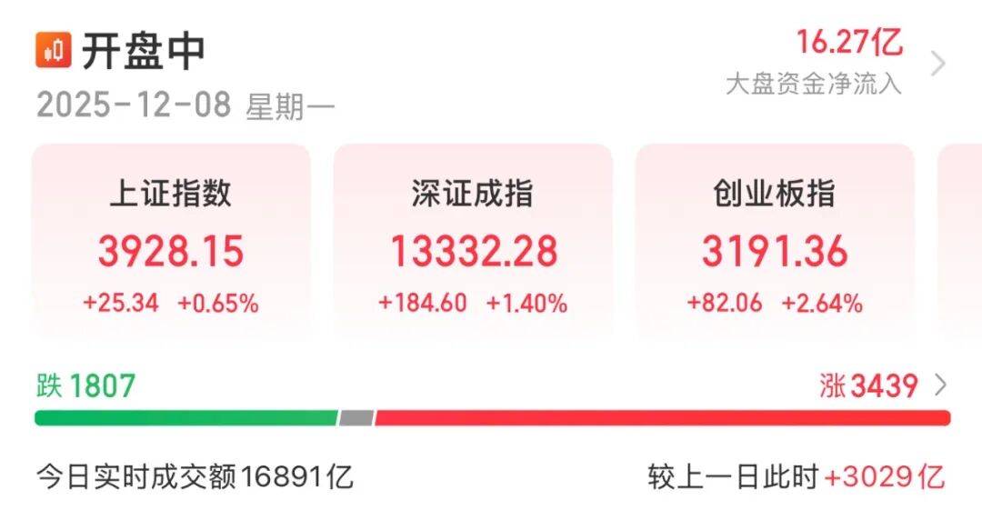 朋友们,周一好,今天,"牛市旗手"再度崛起! 12月8日,A股券商股再度拉升,兴业证券直线涨停,东北证券涨超7%。另外,以光通信为代表的算力链和商业航天板块表现强劲,中际旭创、天孚通 信、长光华芯、源杰科技、仕佳光子、东田微等个股大涨,盘中股价均创历史新高。 商业航天板块近期持续上涨,机构认为是板块迎来"政策面、业绩 面、技术面"三重拐点。 截至发稿,上证指数上涨0.65%,深证成指上涨1.40%,创业板指上涨2.64%。 消息面上,会议指出,明年经济工作要坚持稳中求进、提质增效,继续实施更加积极的财政政策和适度宽松的货币政策,发挥存量政策和增量政策集成效 应,加大逆周期和跨周期调节力度,切实提升宏观经济治理效能。要坚持内需主导,建设强大国内市场;坚持创新驱动,加紧培育壮大新动能;坚持改革 攻坚,增强高质量发展动力活力;坚持对外开放,推动多领域合作共赢;坚持协调发展,促进城乡融合和区域联动;坚持"双碳"引领,推动全面绿色转 型;坚持民生为大,努力为人民群众多办实事;坚持守牢底线,积极稳妥化解重点领域风险。 A股市场迎来了一系列政策和市场层面的利好,为市场情绪和长期发展提供了支撑。星图金融研究院认为,本周,A股 ...