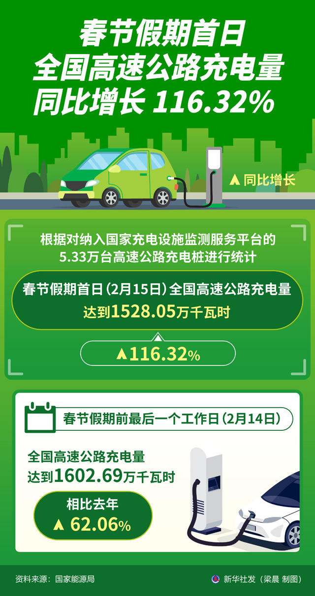 新华社发 梁晨 制图 记者2月16日从国家能源局获悉,根据对纳入国家充电设施监测服务平台的5.33万台高速公路充电 桩进行统计,春节假期首日(2月15日)全国高速公路充电量达到1528.05万千瓦时,同比增长 116.32%。 着我假期信号 全国高速公路充电量 13增长 116.32% A 同比增长 根据对纳入国家充电设施监测服务平台的 5.33万台高速公路充电桩进行统计 春节假期首日(2月15日)全国高速公路充电量 达到1528.05万千瓦时 A116.32% 春节假期前最后一个工作日(2月14日) 全国高速公路充电量 达到1602.69万千瓦时 相比去年 ...