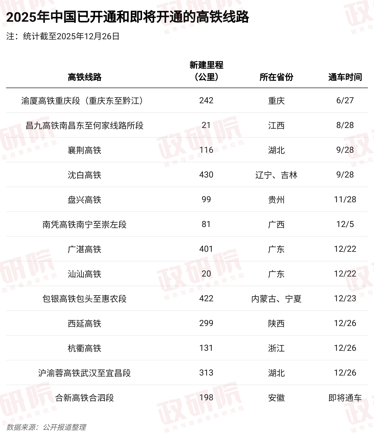 一条新高铁的开通,其意义远不止于轨道里程数字的增加,更 在于它对既有区域经济格局的重构。 作者:刘亚宁 封图:图虫创意 2025年收官在即,中国高铁网络也迎来一轮密集更新。 12月22日,广湛高铁和汕汕高铁汕头至汕头南段开通运营,凭借这两条线路,广东省的高铁运营 里程再次回到全国榜首。12月23日,包银高铁包头至惠农段通车,至此,包银高铁实现全线贯通 运营。12月26日,杭衢高铁、西延高铁、沪渝蓉高铁武汉至宜昌段也全部通车。此外,合新高铁 合泗段也在为开通运营做最后准备。 据经济观察报统计,截至2025年12月26日,2025年已开通的高铁共计12条,高铁营业总里程已 突破5万公里。其中,新增运营里程约2575公里,湖北增长最多,达429公里。 | 刘亚宁制图 | | --- | 厦门大学经济学系副教授丁长发对经济观察报表示,今年新开通的高铁线路呈现出两个特点。其 一,是完善国家"八纵八横"的主干网络,属于在国家层面"搭骨架、补缺口",让高铁主动脉更为 贯通和完整;其二,是聚焦区域内部线路的"拾遗补缺",通过健全区域内部的高铁网络,带动特 定区域内的交通升级、人员高效流动与物流畅通。 从路网结构看,近期新开通 ...