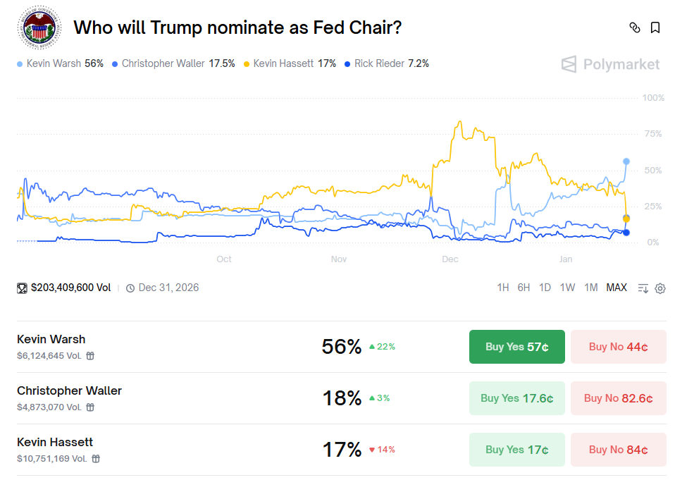 Core Viewpoint - The competition for the next Federal Reserve Chair has intensified, with Kevin Hassett and Kevin Warsh emerging as the leading candidates, influenced by recent endorsements and market predictions [1][2]. Group 1: Candidates and Market Predictions - Kevin Warsh has gained significant traction, with prediction markets showing his chances at 48% on Kalshi and 49% on Polymarket, while Kevin Hassett's chances are at 41% and 43% respectively [1]. - Stephen Myrow, a partner at Beacon Policy Advisors, suggests that Warsh's chances may be overstated compared to Hassett, who is closer to Trump's inner circle [2]. Group 2: Concerns and Endorsements - Concerns have been raised about Hassett's suitability due to his overt support for Trump's policies, which could undermine the Federal Reserve's independence [1]. - Jamie Dimon, CEO of JPMorgan, has publicly supported Warsh, adding weight to his candidacy [1]. Group 3: Background of Kevin Warsh - Kevin Warsh is a known critic of the Federal Reserve, having served as a governor from 2006 to 2011, and has held various roles in academia and investment [3]. - Warsh's advocacy for lower interest rates contrasts with his previous hawkish stance during his tenure at the Fed [3][4]. Group 4: Perspectives on Hassett - Hassett has countered concerns about being a "mouthpiece" for Trump, arguing that his leadership could differ from his past affiliations [5]. - E.J. Antoni from the Heritage Foundation believes that fears regarding Hassett's partisanship are exaggerated, emphasizing the historical context of the Fed's independence [5].