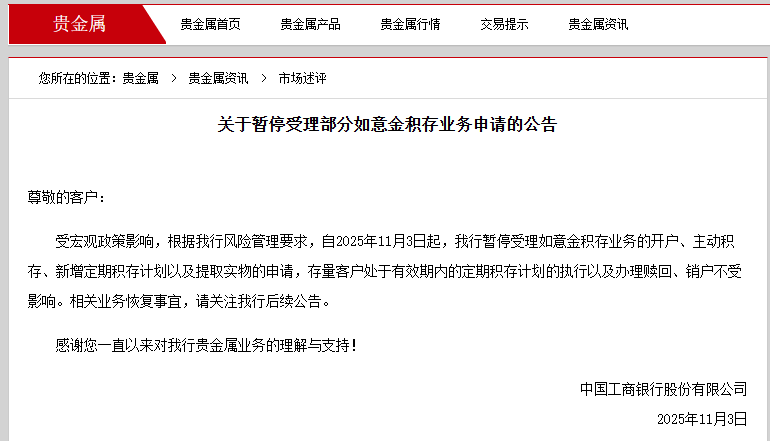 同日,建设银行也发布公告,自2025年11月3日(含)起,建行暂停受理易存金业务实时买入、新增定 投买入、实物金兑换等申请,存量客户易存金定投计划的执行、赎回以及销户不受影响;暂停个人黄金 积存兑换实物贵金属、账户黄金兑换实物贵金属等申请,其他个人黄金积存业务不受影响。 同时,两家银行均表示,相关业务恢复事宜,请关注银行后续公告。 今天(11月3日),工商银行发布公告,表示受宏观政策影响,根据工行风险管理要求,自2025年11月3 日起,工行暂停受理如意金积存业务的开户、主动积存、新增定期积存计划以及提取实物的申请,存量 客户处于有效期内的定期积存计划的执行以及办理赎回、销户不受影响。 ...
