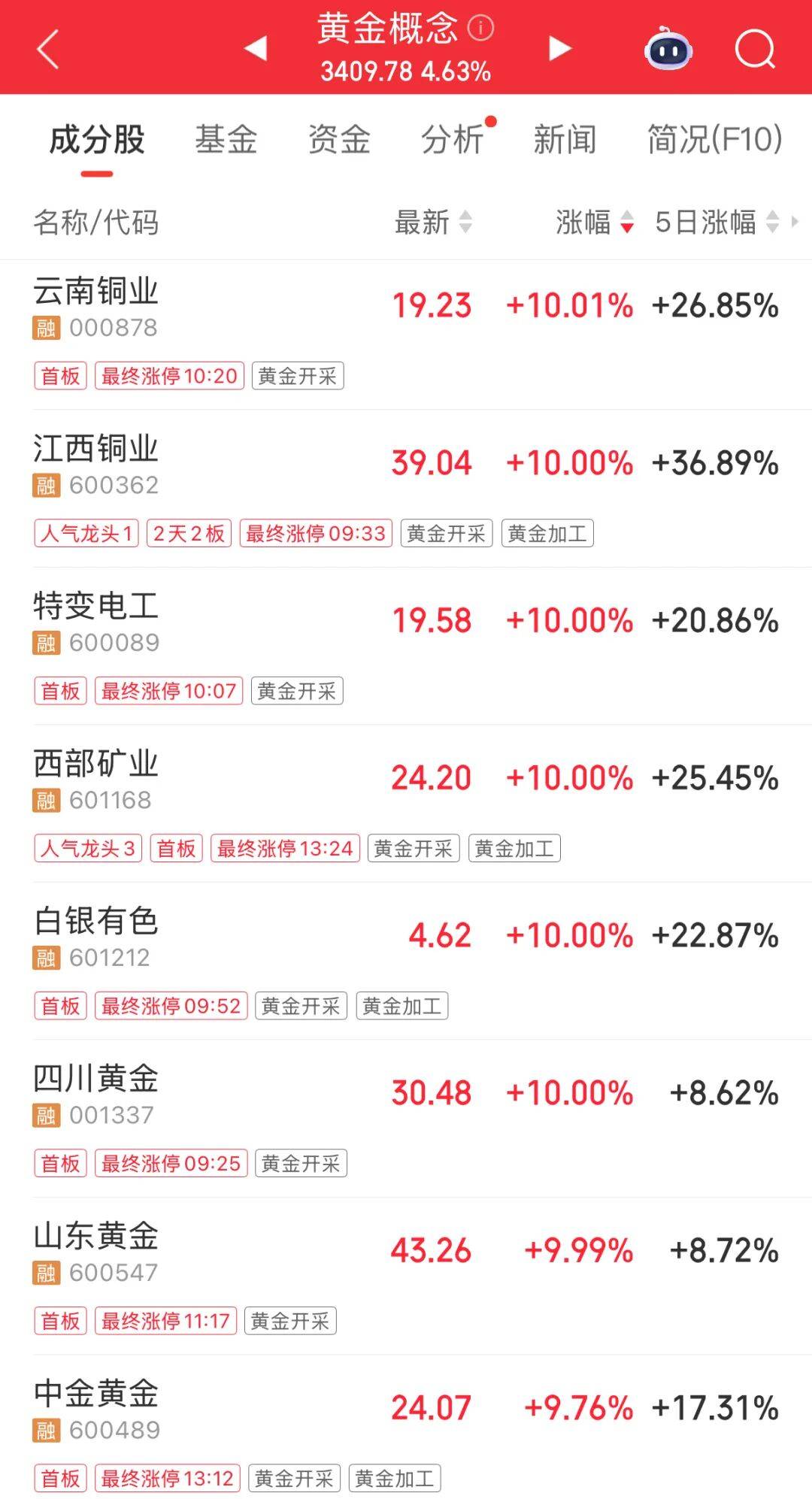 随着国际金价走高,国内黄金板块大涨。 以5.10亿元竞得 新疆一处金矿普查探矿权 10月8日晚间,四川黄金发布公告称,8月13日,新疆维吾尔自治区自然资源厅委托新疆维吾尔自治区政务服务和公共资源交易中心发布了《2025年新疆博 乐市夏尔希里酒店地热普查等9个探矿权挂牌出让公告》。 9月30日,四川黄金以5.10亿元竞得新疆高昌区库格孜—觉北金矿普查探矿权。该勘查区处于中 国重要的金矿成矿带——中天山成矿带,矿体受北西—南东向的背斜和断层控制,勘查区金异常带长达数公里,与控矿构造的方向一致,成矿地质条件较 为优越,具有较大的找矿潜力。 四川黄金表示,此次竞买取得新疆高昌区库格孜—觉北金矿普查探矿权,符合公司主责主业定位和未来发展战略,有利于增加资源量,提升公司核心竞争 力。本次竞买的资金来源为自有资金或银行贷款。本次交易不构成关联交易,亦不构成重大资产重组。 四川黄金2025年半年度报告显示,公司业务主要围绕梭罗沟金矿矿山建设、开采、选矿及金精矿、合质金的销售展开。公司将采出的原生矿运至选厂,经 过浮选工艺得到产品金精矿;将采矿阶段随采出的氧化矿运至堆浸场,经过喷淋浸出工艺得到产品合质金。公司将金精矿和合质金销 ...