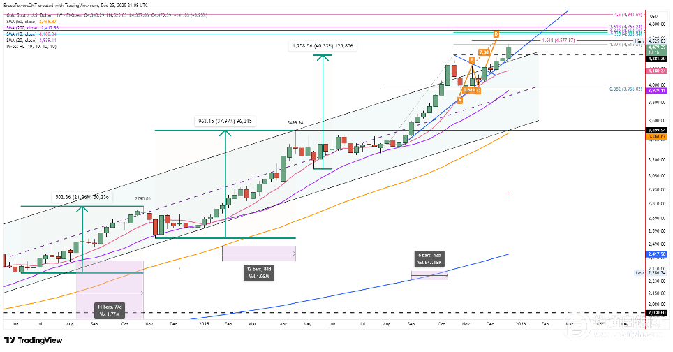 Core Viewpoint - Gold has confirmed a long-term bullish trend following a breakout, with a potential upward movement if the closing price remains above $4,381 [1] Group 1: Price Movement and Technical Analysis - The recent price action indicates a long-term bullish breakout, with a closing price on Wednesday at $4,479, suggesting a high probability of confirming the breakout [1] - Gold prices are on track to complete eight consecutive weeks of gains after a brief two-week pullback in October, reaching a new high of $4,526 [1] - The first significant upward target is set at the 127.2% extension level of the previous pullback at $4,516, which aligns with this week's high [3] Group 2: Support and Resistance Levels - The previous high of $4,381 and the 10-day moving average now at $4,360 form a critical potential support zone [3] - A bullish reversal pattern above $4,381 would indicate strong support, while a pullback to this level is anticipated as a first test of the breakout [3] Group 3: Market Trends and Momentum - The current upward trend, which began at the low point in October, may still be in the early stages of a larger upward wave, with historical trends showing varying durations of sustained new highs [4] - The recent price action confirms the strength of the current bullish trend, with the next upward target focusing on the 161.8% projection of the upward ABCD pattern, extending from $4,664 to $4,713 [5]