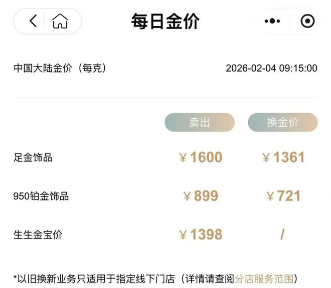 来源:西安晚报 近段时间,黄金价格不断波动。 2月4日,现货黄金重新站上5000美元大关,一度涨超2%。国内金饰价格方面,周生生足金饰品报1600 元/克,较前一日1498元/克涨102元。 | < ω | 匿日美价 | | | (0) | | --- | --- | --- | --- | --- | | 中国大陆金价(每克) | | | 2026-02-04 09:15:00 | | | | 英H | | 换金价 | | | 足金饰品 | | ¥ 1600 | ¥1361 | | | 950铂金饰品 | | ¥ 899 | ¥721 | | | 生生金宝价 | | ¥ 1398 | | | 记者在杭州白马珠宝市场看到,不少市民来此选购黄金饰品,咨询价格。 一位女顾客表示,她2016年毕业起就开始买黄金,那个时候金价才每克两三百元,她看好黄金的长期保 值特性,因为货币长期易贬值,"高中政治老师第一课就说了,黄金具备稀缺性,可对冲货币贬值风 险"。 专家:黄金连续多日的暴跌 2月3日下午,上海黄金交易所发布《关于调整黄金部分合约保证金水平和涨跌停板的通知》,根据《上 海黄金交易所风险控制管理办法》的有关规定, ...