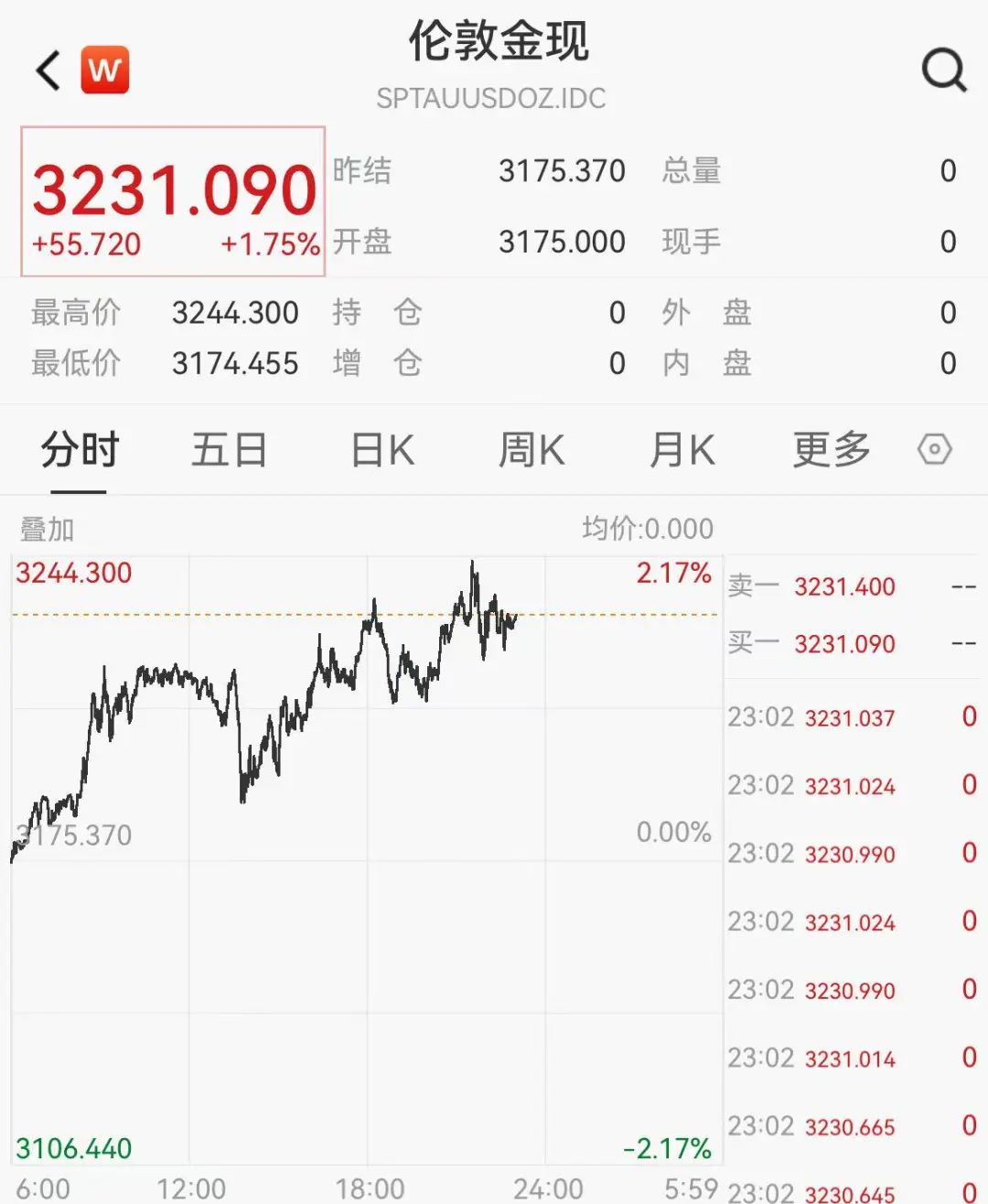 全球金融市场动荡,避险需求推动黄金价格持续上涨并再创历史新高。 4月11日,国际金价再度大涨,现货黄金站上3200美元关口,再创历史新高。 截至发稿,伦敦金现涨超1.7%,报3231.09美元/盎司,COMEX黄金涨2.2%,报3247.3美元/盎司。 | W | 伦敦金现 | | | | | | | | --- | --- | --- | --- | --- | --- | --- | --- | | | SPTAUUSDOZ.IDC | | | | | | | | 3231.090 | | 昨结 | 3175.370 | 总量 | | 0 | | | +55.720 | +1.75% 开盘 | | 3175.000 | 现手 | | O | | | 最高价 | 3244.300 | 寺 | 0 | Ar | 참 | 0 | | | 最低价 | 3174.455 | 播 世 | 0 | 内 | | | | | 分时 | 五日 | 日K | 周K | 目K | 申文 | | | | 叠加 | | | | 均价:0.000 | | | | | 3244.300 | | | | 2.17% | 堂- 3231.4 ...