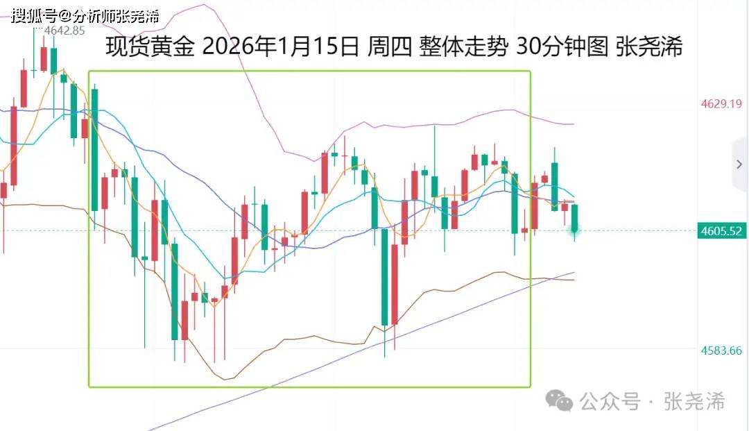张尧浠:金价多头减弱高位震荡、前景预期仍是蓄力待发 上交易日周四(1月15日):国际黄金触底回升T型收跌,维持着高位震荡格局,但也令短期金价面临震荡调整走低预期,但看涨前景依然不变,如回撤走 低,下方关注10日均线及中轨线支撑仍可逢低看涨,如反弹走强打破近日震荡持稳收阳,则可顺势跟进继续看涨攀升。 周线级别,金价上周再度走强收复前景跌幅,减弱了其阴包阳的见顶看空形态,同时本周再度走强拉升,走势也持稳运行在5-10周均线上方,布林带也继 续向上延伸,看涨前景加大,未来一两周将有望继续攀升触及4700美元关口位置。 具体走势上,金价自亚市开于4629.55美元/盎司,日内走势颇为震荡,先行录得日内高点4632.20美元,并震荡走低,并录得日内低点4581.25美元,之后 又整体震荡回升,最终收于4615.70美元,日振幅50.95美元,收跌13.85美元,跌幅0.3%。 影响上,日内先行受到周三尾盘的回撤压力,以及特朗普暂缓决定是否对伊朗发动军事打击,打压了黄金的避险需求,令其震荡回撤,之后因支撑买盘而 触底回升,但美盘数据,初请失业金人数意外下降,这增强了美联储将在数月内按兵不动的预期,再度限制金价多头,使其仍 ...