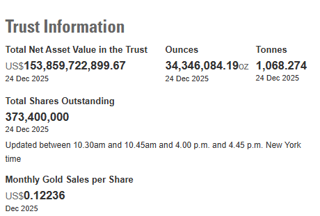 截至12月24日 全球最大的黄金ETF——SPDR Gold Trust的黄金持仓量为1068.27吨
