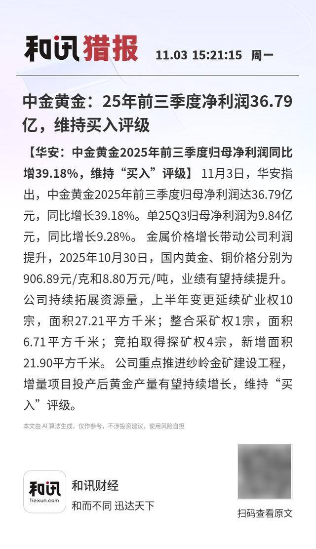 中金黄金:25年前三季度净利润36.79亿,维持买入评级