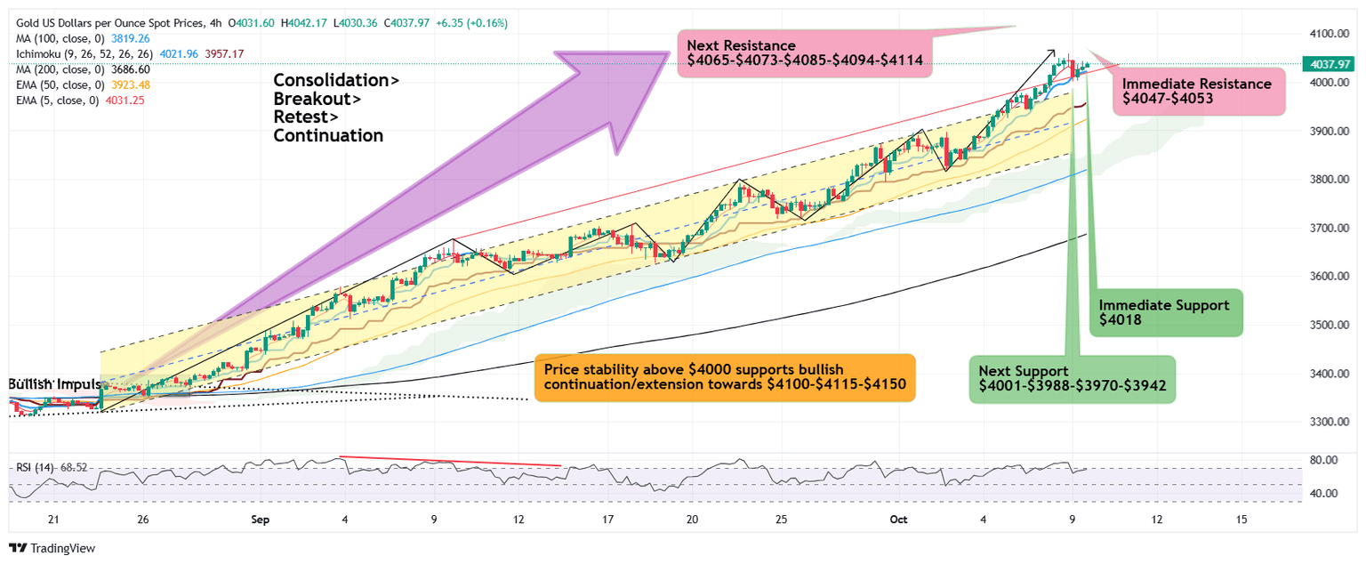 Core Viewpoint - Gold prices continue to show strong bullish momentum, recently touching $4060, with a slight pullback to the psychological level of $4000 being quickly absorbed by buying interest [1][3]. Fundamental Drivers - Ongoing U.S. government shutdown and lack of clear agreements on the debt ceiling and spending limits have raised investor concerns, increasing the demand for gold as a safe-haven asset [3]. - The Federal Reserve's meeting minutes indicate a focus on growth risks rather than inflation pressures, enhancing gold's appeal as a hedge [3]. - Geopolitical risks, particularly in the Middle East and Europe, continue to attract global attention, further supporting gold demand [3]. - Despite record high gold prices, central banks worldwide are still increasing their gold reserves, indicating strong structural demand for gold in the long term [4]. - Persistently low bond yields make non-yielding gold a valuable store of value [5]. Technical Drivers - Gold maintains a strong bullish market structure, supported by stability above the $4000 psychological level and a series of higher highs and lows, indicating a continuation of the bullish rebound [6]. - Recent resistance levels at $4048-$4053 have limited upward attempts, with bulls needing to break through this resistance for further gains [7]. - The 5-day moving average on the 4-hour chart is at $4032, showing bullish momentum, while levels below $4018-$4008 may present additional buying opportunities [8]. - Daily and monthly RSI readings are at 90, indicating overbought conditions, suggesting caution regarding potential price corrections from these levels or the next bullish target of $4115 [9]. Overall Outlook - Gold retains a strong bullish momentum aligned with the primary trend, but the likelihood of a price correction is increasing, potentially around $4115 or sooner [10]. - As long as the sequence of higher highs and lows remains intact, the bullish rebound will continue [11].
