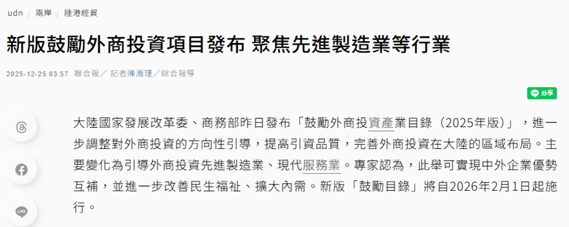 Core Viewpoint - The National Development and Reform Commission (NDRC) and the Ministry of Commerce have released the "Encouragement Directory for Foreign Investment Industries (2025 Edition)," effective from February 1, 2026, aimed at attracting and utilizing foreign investment more effectively [1]. Group 1: Policy Changes - The revised directory includes a total of 1,679 entries, with a net increase of 205 entries and 303 modifications compared to the 2022 version [1]. - The national directory for encouraging foreign investment now contains 619 entries, with an increase of 100 entries and 131 modifications [1]. - The directory for advantageous industries in the central and western regions has 1,060 entries, with an increase of 105 entries and 172 modifications [1]. Group 2: Focus Areas for Investment - The new directory encourages foreign investment in advanced manufacturing, expanding entries related to end products, components, and raw materials to enhance the development of the industrial and supply chains [2]. - It promotes foreign investment in modern services, adding entries in business services, technical services, scientific research, and service consumption to foster high-quality development in the service sector [2]. - The directory also aims to attract foreign investment to the central and western regions, Northeast China, and Hainan Province, considering local resources, advantages, and industrial development [2]. Group 3: Implementation Strategies - The NDRC plans to enhance guidance and coordination to ensure the effective implementation of these policies [2]. - Efforts will be made to improve the satisfaction of foreign enterprises through special actions to address their investment and operational challenges [3]. - A platform for investment cooperation between Chinese and foreign enterprises will be established to facilitate project negotiations and signings [3].