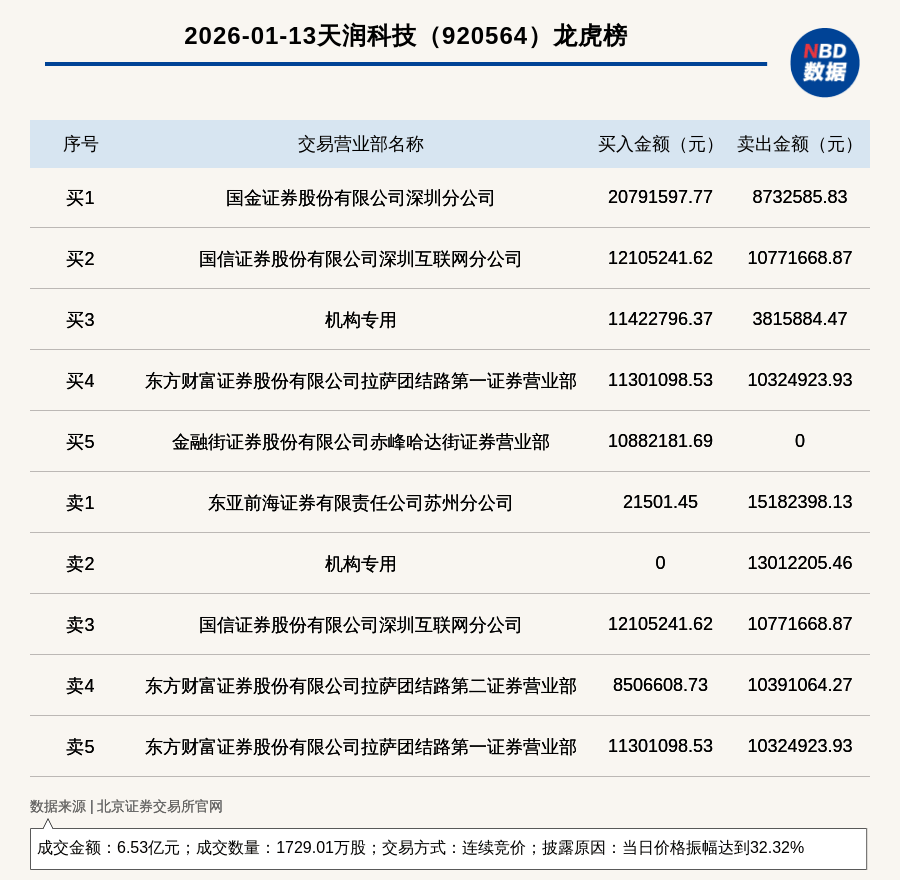 (记者 曾健辉) 免责声明:本文内容与数据仅供参考,不构成投资建议,使用前核实。据此操作,风险自担。 每日经济新闻 每经讯,2026年1月13日,北交所上市公司天润科技(920564,收盘价:36.49元)登上龙虎榜,交易方式是连续竞价,披露原因 是当日价格振幅达到32.32%,成交数量1729.01万股,成交金额6.53亿元。买一席位为国金证券股份有限公司深圳分公司,买入 2079.16万元;卖一席位为东亚前海证券有限责任公司苏州分公司,卖出1518.24万元。 | | 2026-01-13天润科技 (920564) 龙虎榜 | | | | --- | --- | --- | --- | | 序号 | 交易营业部名称 | 买入金额(元) | 卖出金额(元) | | ਐੱਗ | 国金证券股份有限公司深圳分公司 | 20791597.77 | 8732585.83 | | 买2 | 国信证券股份有限公司深圳互联网分公司 | 12105241.62 | 10771668.87 | | 买3 | 机构专用 | 11422796.37 | 3815884.47 | | ग्रेडर | 东方财富证券股份有限公司拉萨团 ...