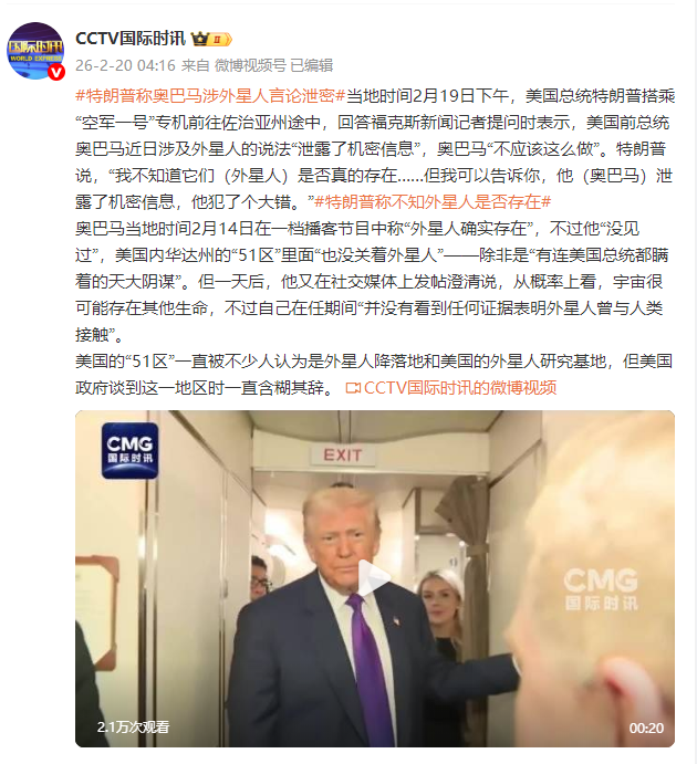 来源:@CCTV国际时讯 当地时间2月19日下午,美国总统特朗普搭乘"空军一号"专机时回答福克斯新闻记者提问表示,美国前 总统奥巴马近日涉及外星人的说法"泄露了机密信息",奥巴马"不应该这么做"。特朗普说,"我不知道 它们(外星人)是否真的存在……但我可以告诉你,他(奥巴马)泄露了机密信息,他犯了个大错。" 奥巴马当地时间2月14日在一档播客节目中称"外星人确实存在",不过他"没见过",美国内华达州的"51 区"里面"也没关着外星人"——除非是"有连美国总统都瞒着的天大阴谋"。但一天后,他又在社交媒体 上发帖澄清说,从概率上看,宇宙很可能存在其他生命,不过自己在任期间"并没有看到任何证据表明 外星人曾与人类接触"。 美国的"51区"一直被不少人认为是外星人降落地和美国的外星人研究基地,但美国政府谈到这一地区时 一直含糊其辞。 ...