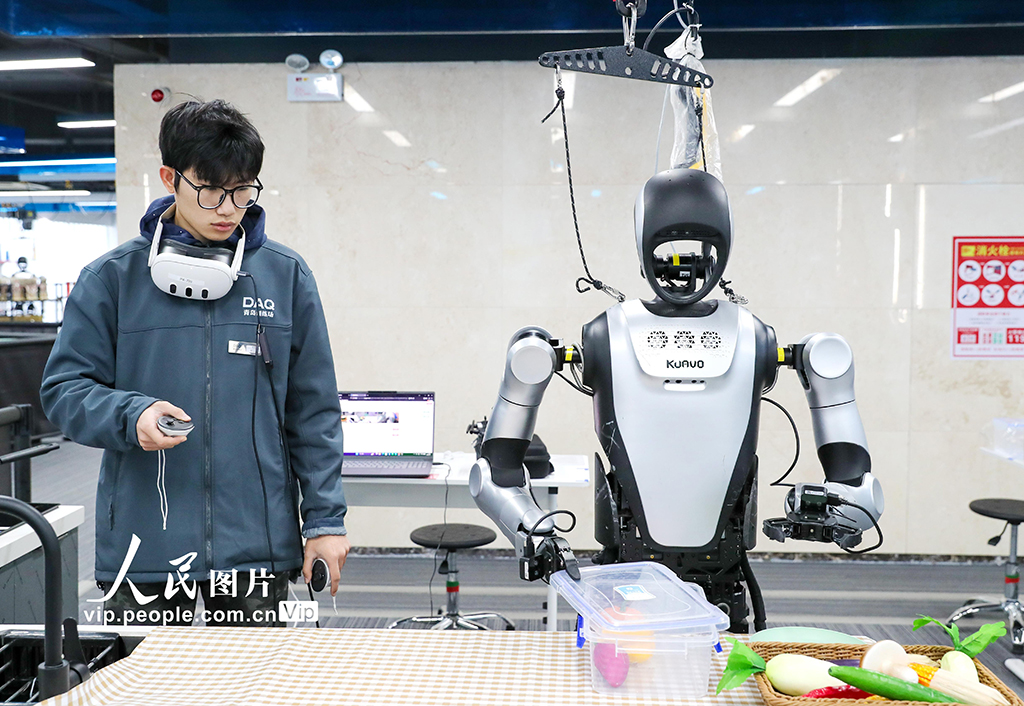 2026年1月12日,在山东青岛人形机器人数据采集训练场内,数据采集员头戴VR设备、手持感应手柄,指导人形机器人进行抓取、搬运、分拣等 精细化操作训练。 该训练场基于5G-A网络,实现毫秒级人机协同,通过七大真实场景获取高质量真机数据,推动机器人从"模仿"向"自主"演进,并以场景实训破解 产业化应用瓶颈,为行业持续输送"实训数据"与"技能经验"。张进刚摄(人民图片网) ...