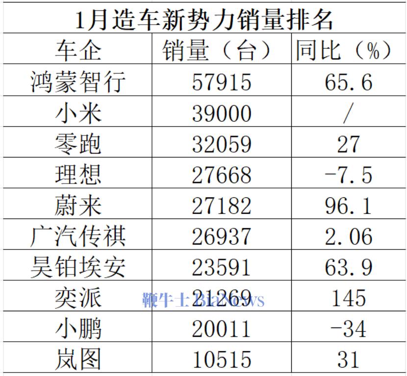 2月首日,多家造车新势力陆续公布2026年首月销量情况。 通常12月为汽车销售的传统旺季,各厂商销量会达到全年最高点,转年1至2月则面临较大下行压力。今年叠加新 能源购置税从全免改减半等因素影响,造车新势力销量环比普遍下滑,这一走势基本符合市场普遍预期。 数据从侧面佐证这一趋势。乘联分会数据显示,1月1日至11日,全国乘用车市场零售32.8万辆,同比下降32%; 当期,全国乘用车厂商批发38.1万辆,同比下降40%。 相较同环比表现而言,更值得关注的是头部排名迎来洗牌。根据截至发稿前数据统计,去年稳坐新势力月销冠军 并获得新势力全年销量冠军的零跑汽车,1月被鸿蒙智行 和小米汽车反超,新势力冠军宝座或许要易主。 | | 1月造车新势力销量排名 | | | --- | --- | --- | | 车企 | 销量(台) 同比(%) | | | 鸿蒙智行 | 57915 | 65. 6 | | 小米 | 39000 | | | 零跑 | 32059 | 27 | | 理想 | 27668 | -7.5 | | 蔚来 | 27182 | 96. 1 | | 广汽传祺 | 26937 | 2. 06 | | 吴铂埃安 | ...
