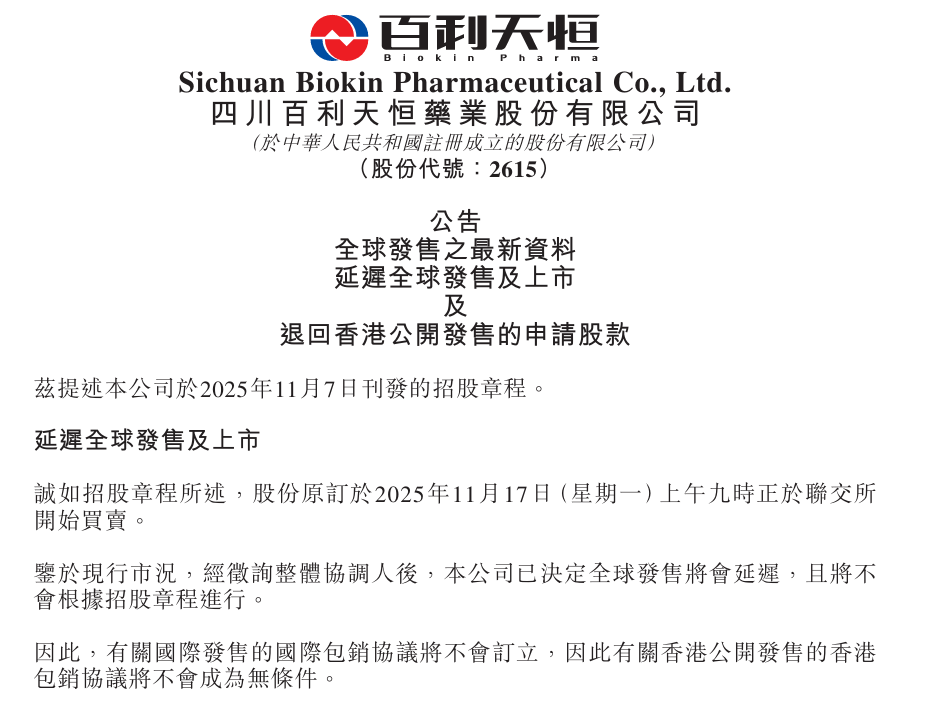 21世纪经济报道记者 韩利明 在H股香港公开发售的最后一日(11月12日),A股上市公司百利天恒(688506.SH)公告称,鉴于当前市场情况,公司决定延迟H股 的全球发售及上市。据悉,本次H股香港公开发售于11月7日至12日期间开展,原计划股票于11月17日在香港联交所挂牌交易。随着 上市计划推迟,百利天恒已同步提示投资者可通过网上白表服务申请退款,相关款项将于11月17日退还。 事实上,百利天恒的H股上市筹备已历时一年有余。早在2024年7月10日,百利天恒便向香港联交所递交了发行上市申请,并分别于 2025年1月21日、9月29日两次重新递交申请。据此前公告披露,本次H股全球发售基础发行股数为863.43万股,其中香港公开发售 86.35万股(可重新分配),占比约10%;国际发售777.08万股(可重新分配),占比约90%,初步确定发行价格区间为347.50港元至 389.00港元。 图片来源:百利天恒公告 2019年至2022年间,百利天恒研发投入从1.81亿元增加至3.75亿元,占营业收入的比例从15.03%上升至53.32%。高额的研发投入导致 公司扣非归母净利润连续四年出现赤字。 为缓解资金困局 ...