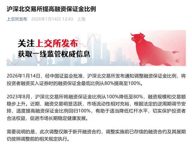 2023年8月,沪深北交易所将融资保证金比例从100%降低至80%,融资规模和交易额稳步上升。近期, 融资交易明显活跃,市场流动性相对充裕,根据法定的逆周期调节安排,适度提高融资保证金比例回归 100%,有助于适当降低杠杆水平,切实保护投资者合法权益,促进市场长期稳定健康发展。 市场交易火爆,午间监管发布新规为融资交易降温。 1月14日,经中国证监会批准,沪深北交易所发布通知调整融资保证金比例,将投资者融资买入证券时 的融资保证金最低比例从80%提高至100%。 来源:北京日报客户端 记者:孙杰 1月14日,A股单边上行,沪指涨逾1%剑指4200点,创业板指大涨逾2%,市场逾4700股上涨。A股半日 成交2.25万亿元。 需要说明的是,此次调整仅限于新开融资合约,调整实施前已存续的融资合约及其展期仍按照调整前的 相关规定执行。 ...