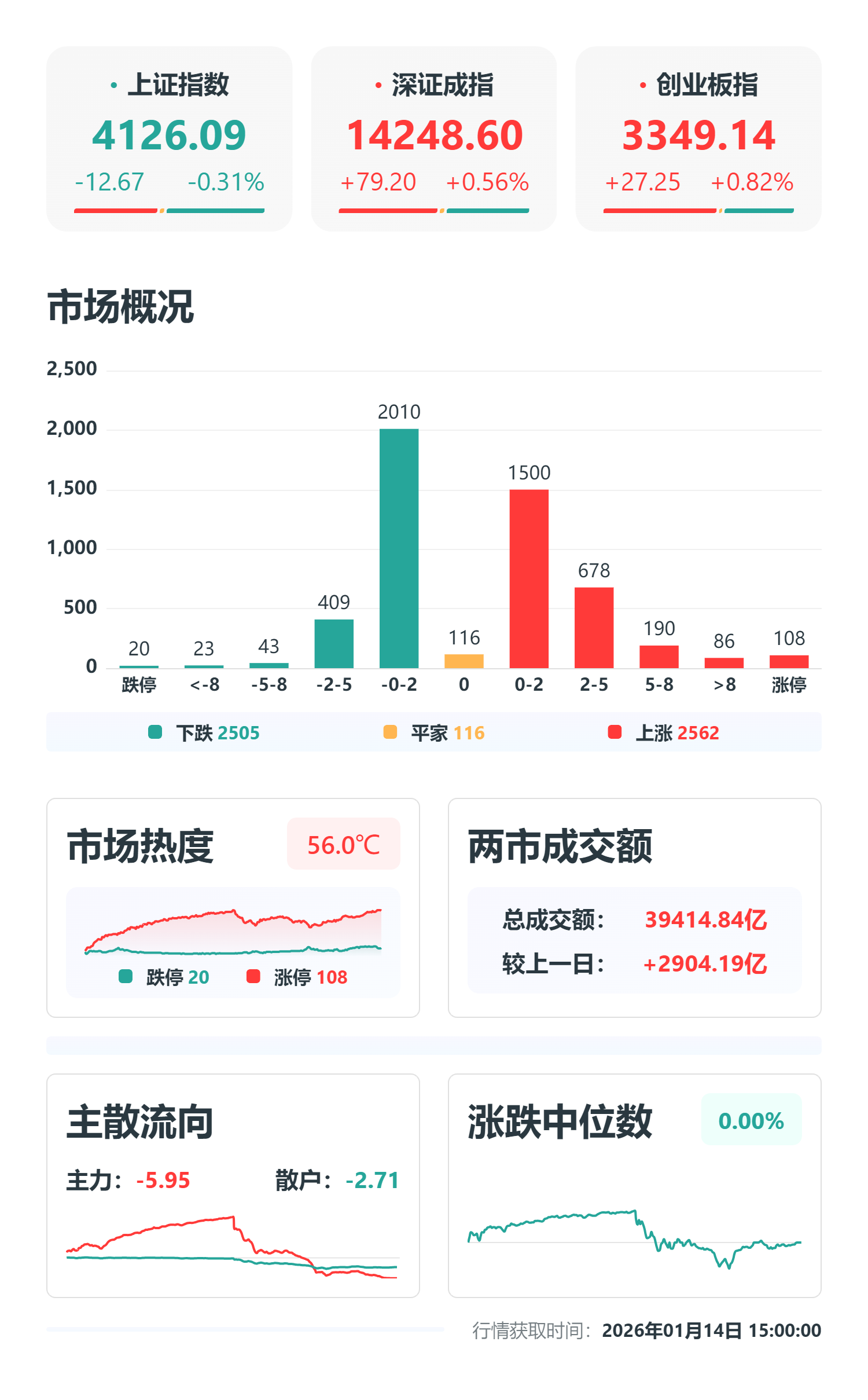 周三,A股高位盘整,早盘一路上扬收复昨日失地,但午后受突发消息影响,高位出现回调。根据交易所数据,1月14日收盘,上证指数跌0.31%报4126.09 点,深证成指涨0.56%,创业板指涨0.82%,沪深300跌0.4%,科创50涨2.13%。 沪深两市2562股上涨,2494股下跌,127股持平,合计成交额3.94万亿元,再创历史新高,逼近4万亿天量,较前一交易日放量约2904.18亿元。 徐小明提到,对于昨天的回落,当时说无法判定规模,今天上午就基本吃掉了昨天的调整。今天的回落,结论也一样,各周期都没有顶部结构,价格也距离 趋势比较远,无法判定高点,所以无法判定高点的级别,这个回落随时有可能结束。 徐小明认为,市场已经很强了,不能要求其更强了。知足者,常乐。 风险提示:此文章不构成投资建议。股市有风险,投资需谨慎。 股票频道更多独家策划、专家专栏,免费查阅>> 责任编辑:钟离 资金方面,大盘主力资金净流出889.40亿元,互联网服务主力资金净流入67.59亿元居首,其次是软件开发、化学原料、贵金属、综合行业;电网设备主力资 金净流出71.31亿元居首,其次是消费电子、半导体、银行、通用设备。 针对突发调整 ...