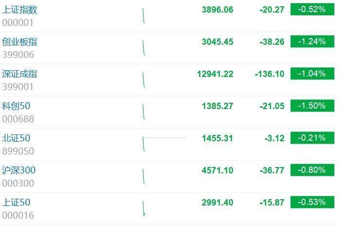 Market Overview - The A-share major indices experienced a decline across the board, with the ChiNext Index, Shenzhen Component Index, and Sci-Tech Innovation 50 Index all falling by over 1% [1] - Nearly 3,200 stocks in the Shanghai, Shenzhen, and Beijing markets saw declines [1] Index Performance - Shanghai Composite Index closed at 3,896.06, down by 20.27 points, or 0.52% [2] - ChiNext Index closed at 3,045.45, down by 38.26 points, or 1.24% [2] - Shenzhen Component Index closed at 12,941.22, down by 136.10 points, or 1.04% [2] - Sci-Tech Innovation 50 Index closed at 1,385.27, down by 21.05 points, or 1.50% [2] - North Star 50 Index closed at 1,455.31, down by 3.12 points, or 0.21% [2] - CSI 300 Index closed at 4,571.10, down by 36.77 points, or 0.80% [2] - Shanghai 50 Index closed at 2,991.40, down by 15.87 points, or 0.53% [2]