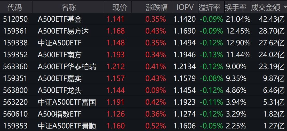 | 代码 | 名称 | 现价 | 涨跌幅 | IOPV 溢折率 换手率 成交金额 | | | --- | --- | --- | --- | --- | --- | | 512050 | A500ETF基金 | 1.141 | 0.35% | 1.1420 -0.09% 21.04% | 42.43亿 | | 159361 | A500ETF易方达 | 1.168 | 0.43% | 1.1690 -0.09% 12.45% | 28.70亿 | | 159338 | 中证A500ETF | 1.148 | 0.35% | 1.1494 -0.12% 12.90% | 27.621Z | | 159352 | A500ETF南方 | 1.193 | 0.34% | 1.1946 -0.13% 11.44% | 24.02亿 | | 563360 | A500ETF华泰柏瑞 | 1.212 | 0.41% | 1.2134 -0.12% 9.00% | 23.19/Z | | 159351 | A500ETF嘉实 | 1.157 | 0.43% | 1.1579 -0.08% 9.35% | 9.87亿 | | ...